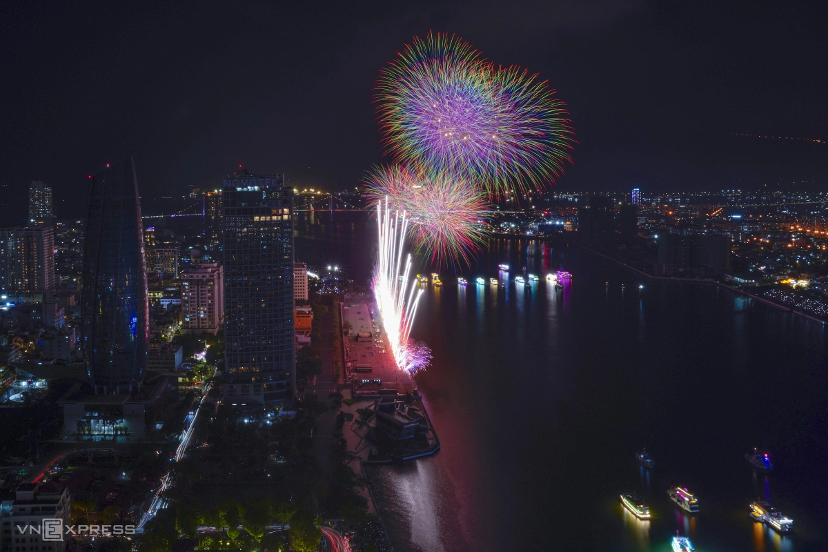 Cao trào màn trình diễn của đội Z121 Vina Pyrotech là khi bầu trời Đà Nẵng bừng sáng trong sắc cờ đỏ sao vàng, xen lẫn những bông sen tím rực rỡ nở tung giữa không trung.