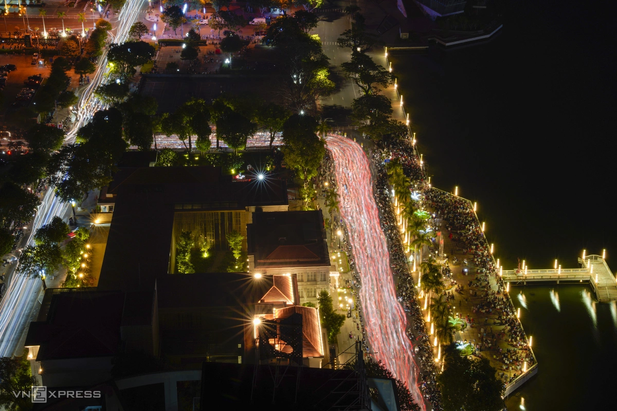 Dòng người di chuyển xe máy thành vệt đỏ trên đường Bạch Đằng, đoạn trước Bảo tàng Đà Nẵng, giáp bãi bắn pháo hoa để ra về, sau khi màn trình diễn pháo hoa kết thúc lúc 21h30.