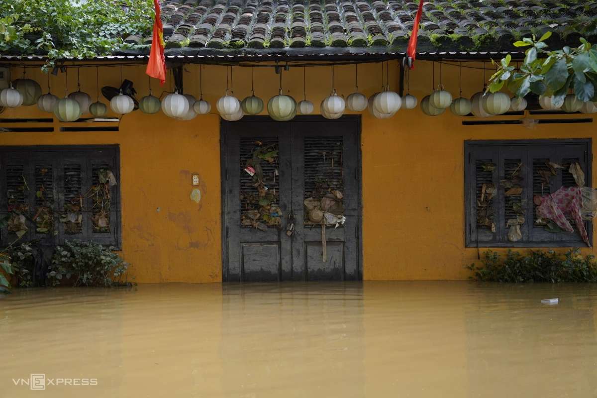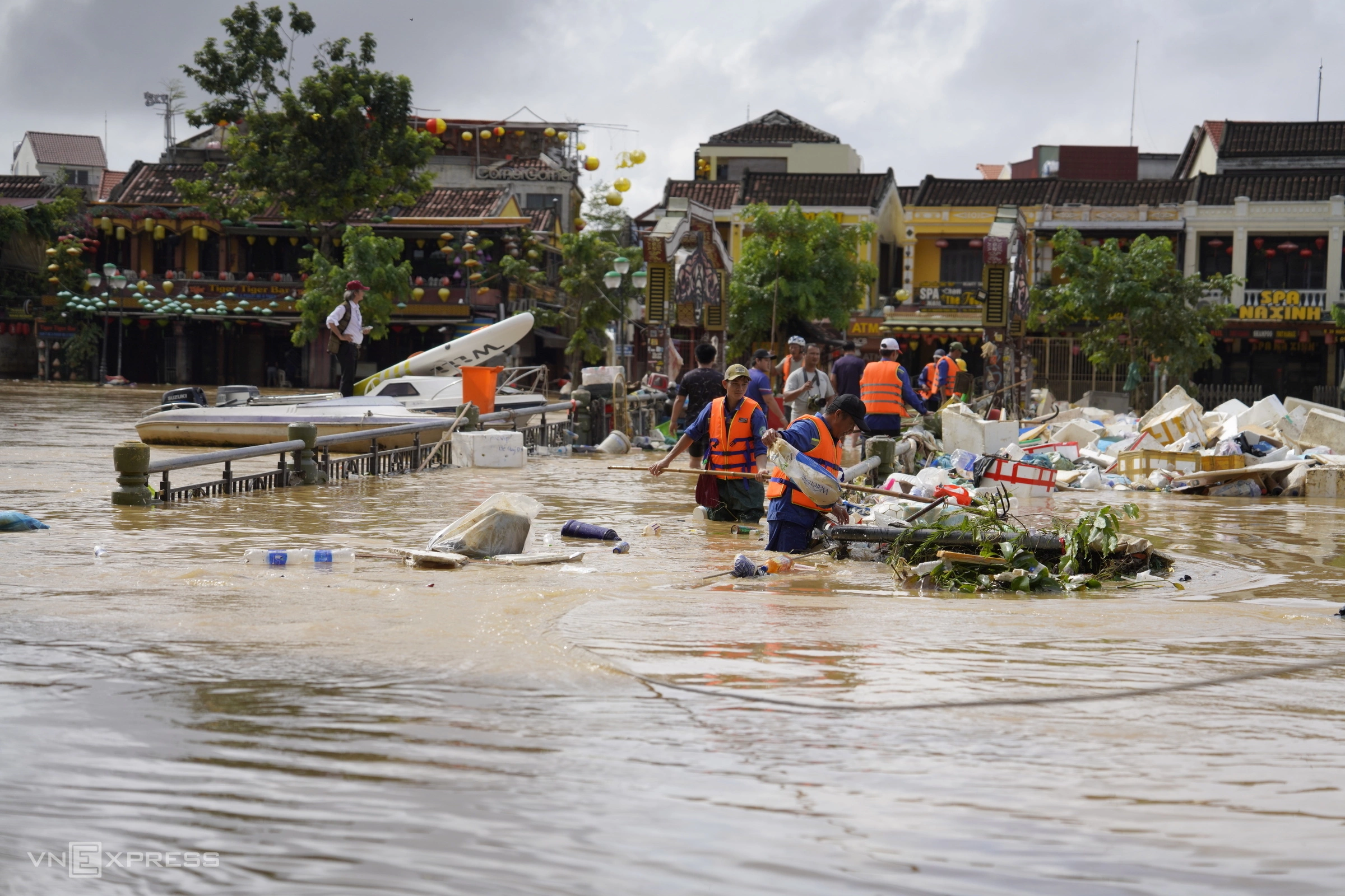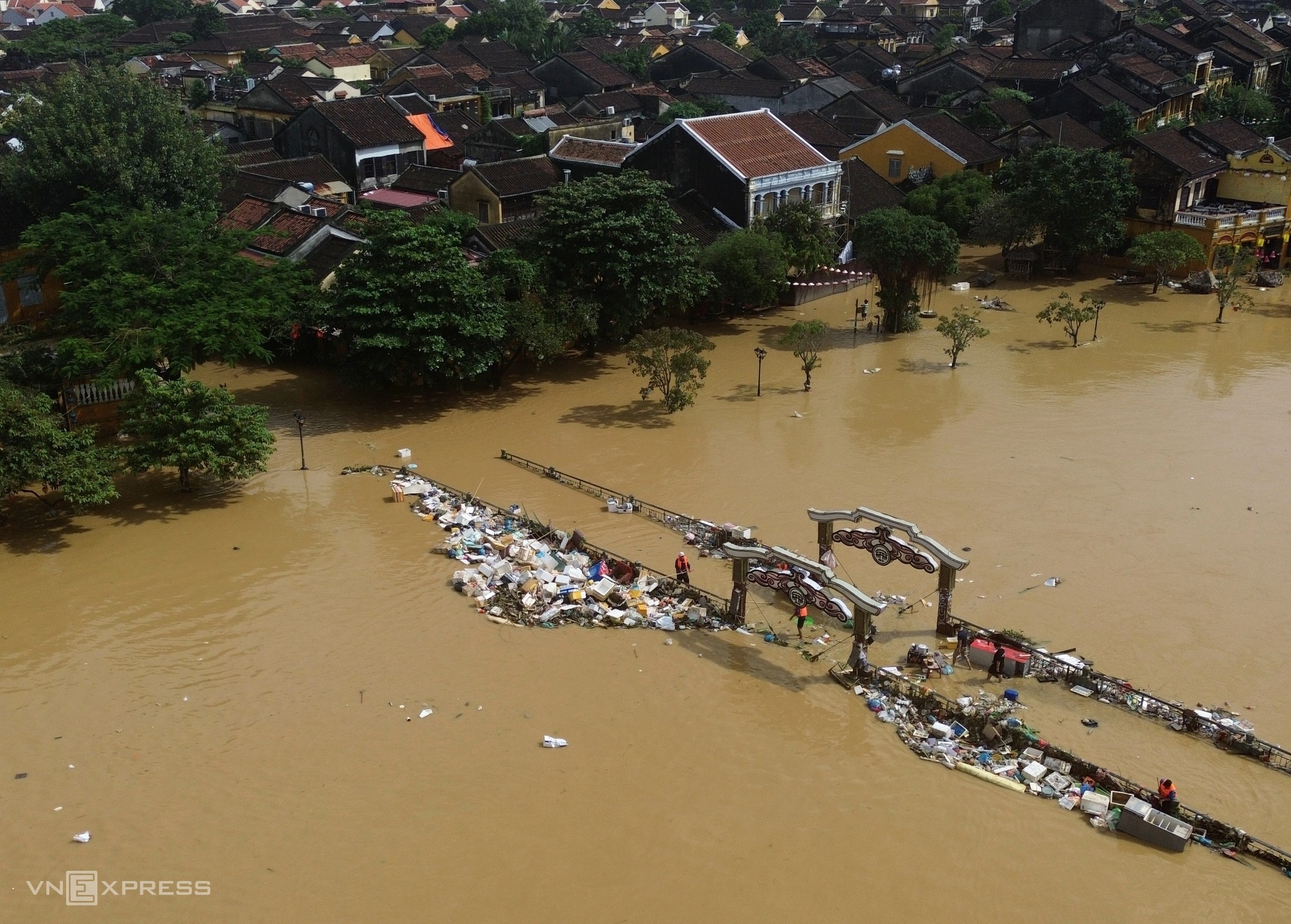 7h sáng, nước sông Thu Bồn tại trạm Câu Lâu rút xuống 3,6 m, giảm 2,02 m so với đỉnh lũ lúc 2h ngày 30/10. Đỉnh lũ mới vượt mức lịch sử năm 1964 khoảng 0,12 m khiến phố cổ Hội An ngập 1-2 m, một số nơi lút mái nhà. Nước rút, rác thải chất đầy phía sau chùa Cầu, biểu tượng của phố cổ Hội An.