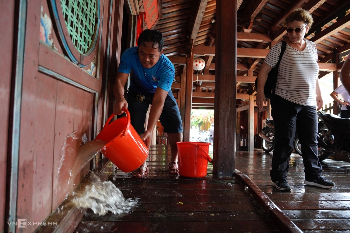 Nước lũ tràn vào chùa Cầu khoảng một mét, đến sáng nay đã rút hết, nhân viên khẩn trương dọn bùn non để đón khách tham quan.
