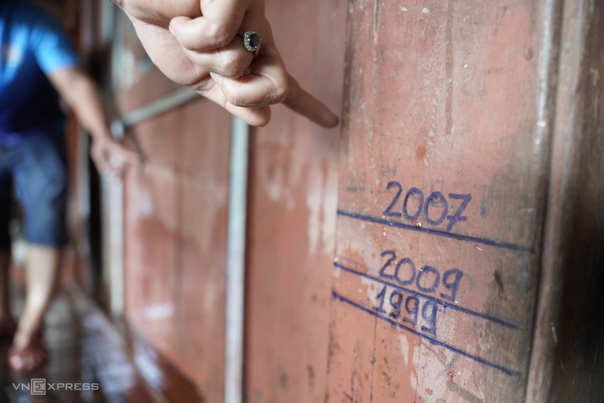 Nhân viên bán vé ở chùa Cầu chỉ tay vào cột gỗ ghi lại các mốc lũ lịch sử ở Hội An. "Đợt lũ này cao hơn đỉnh lũ năm 2007 khoảng 0,2 m, là mức cao nhất trong vài chục năm trở lại đây", chị nói.