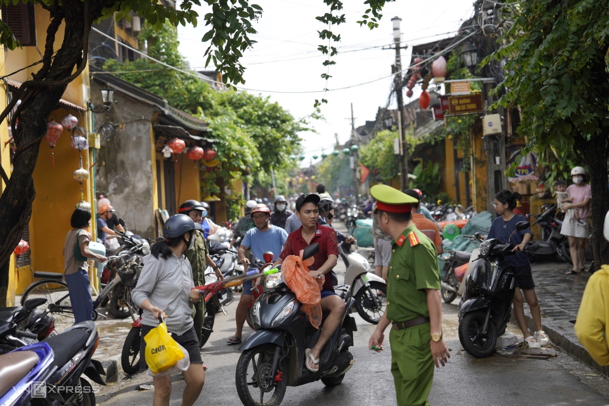 Trên phố đi bộ, nhiều xe máy được người dân gửi tạm để tránh lũ. Công an đang hướng dẫn người dân đưa xe ra ngoài, trả lại không gian cho người đi bộ.