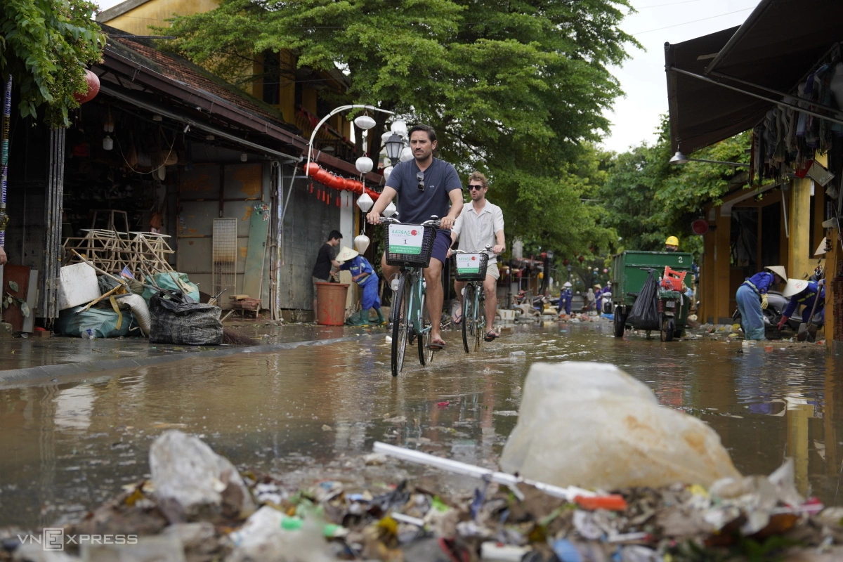 Một số du khách đạp xe dạo phố cổ ngay sau khi nước rút.