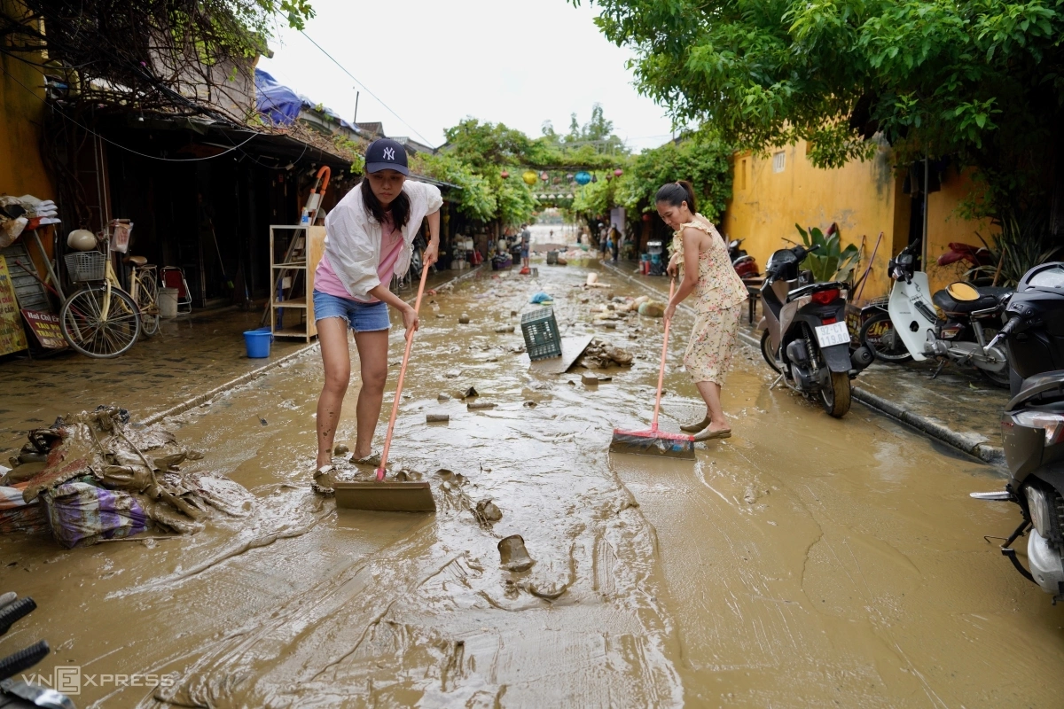 Lũ rút để lại lớp bùn non dày 0,2-0,3 m. Không chờ nhân viên môi trường, người dân phố cổ gọi nhau cùng dọn dẹp.