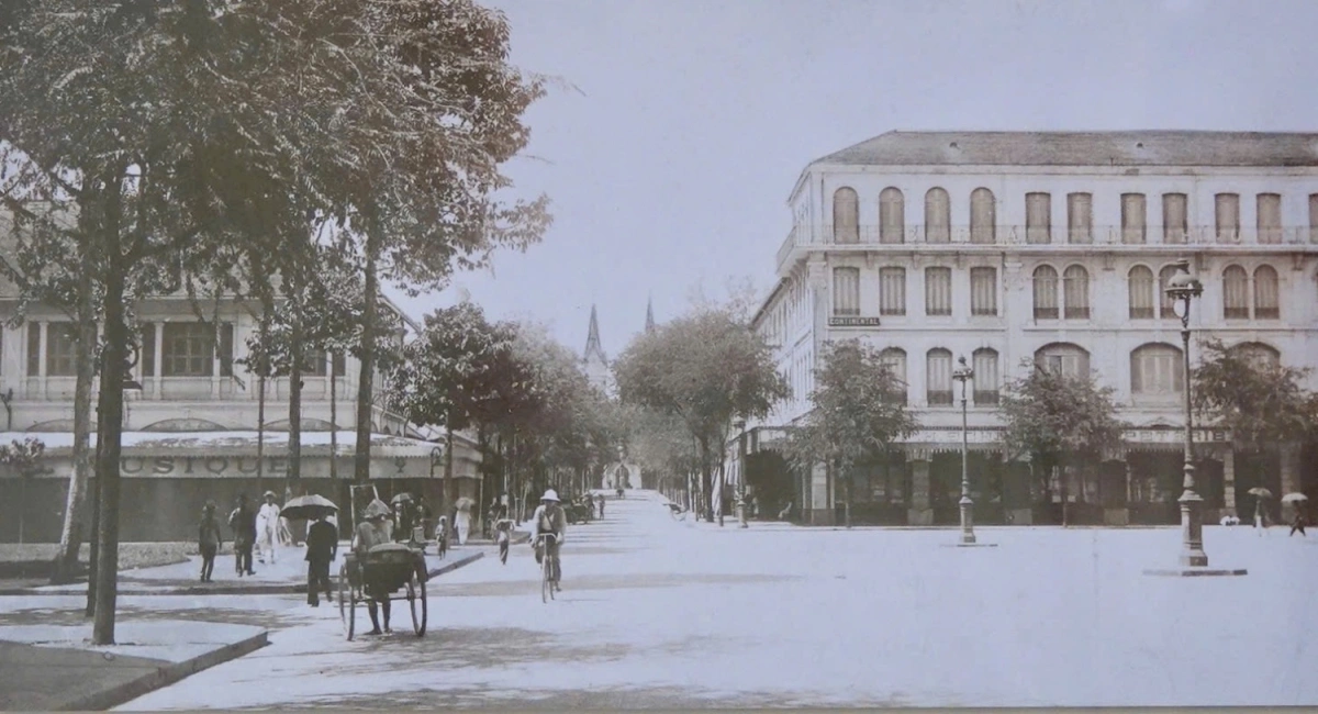 Không gian đường Catinat trước Nhà hát thành phố, phía xa là Nhà thờ Đức bà Sài Gòn. Dài khoảng một km, tập trung những cơ sở thương mại, khách sạn, bưu điện đầu tiên của thành phố, Catinat (nay là đường Đồng Khởi) là một trong những con đường nổi tiếng nhất Sài Gòn - Gia Định.
