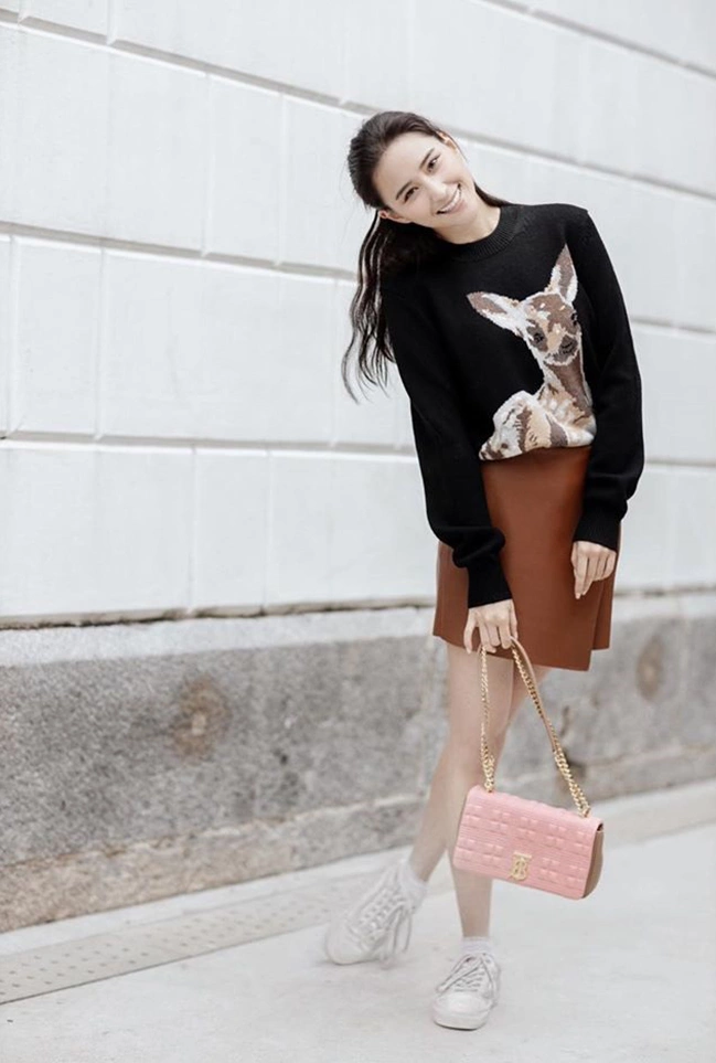 Fashionista 29 tuổi "nghiện" mua sắm hàng hiệu, thường cập nhật mẫu mới của những nhà mốt quốc tế. Cô phối túi của Burberry với áo in hình động vật, váy ngắn, tạo phong cách năng động.