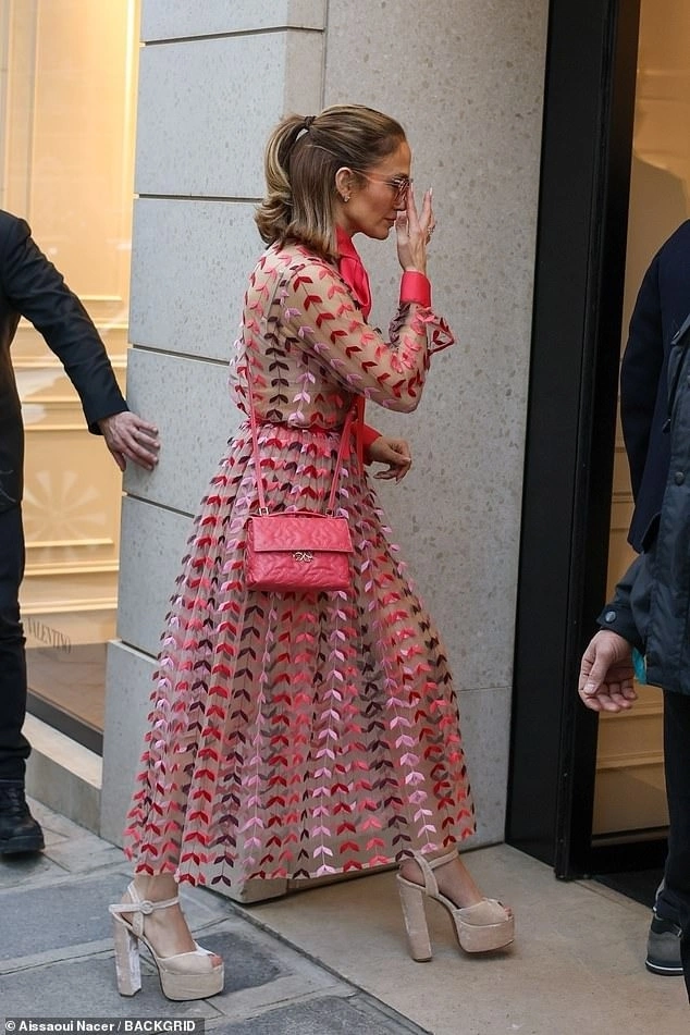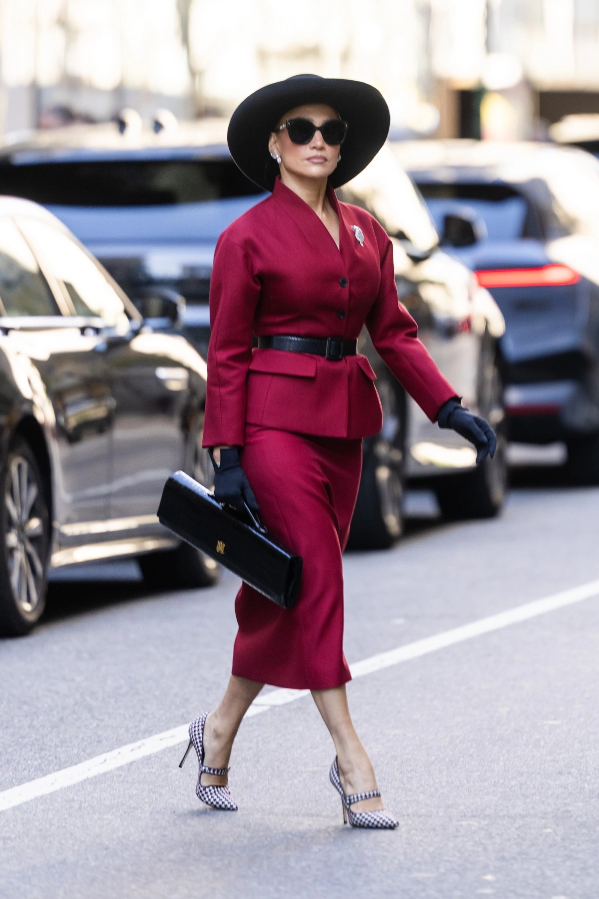 Hôm 10/10, Jennifer xuất hiện trên đường phố New York với bộ váy suit đỏ - một trong những màu hot của Thu Đông năm nay. Cô kết hợp kính râm, găng tay đen, giày cao gót caro đen trắng, xách túi da cá sấu, mũ rộng vành. Diện mạo của cô gợi nhớ đến thời trang cổ điển những năm 1950. Ảnh: GC Images