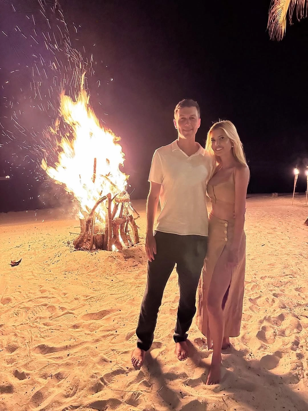 Đầu tháng 9, Ivanka Trump chia sẻ hình ảnh về kỳ nghỉ hè của gia đình. Cô cùng chồng con câu cá, chèo thuyền, đốt lửa trại cùng bạn bè trên bãi biển ở Miami và Bahamas. Trong một bức ảnh trên trang cá nhân, cô và nhà đầu tư bất động sản Jared Kushner diện trang phục thoải mái với phong cách đơn sắc.