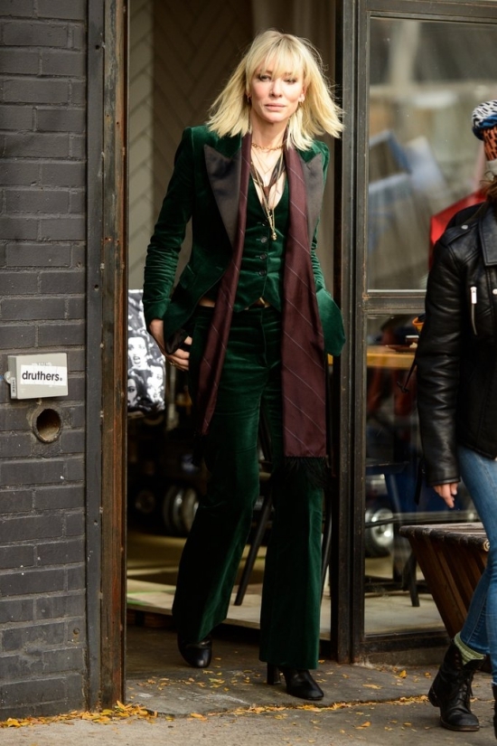 Cate Blanchett vào vai Lou - nữ tướng có phong cách rock n roll rất ngầu và ấn tượng nhất bộ phim. Nhân vật thường chọn suit để thể hiện nữ quyền, trong đó có bộ vest nhung do Burberry thiết kế.