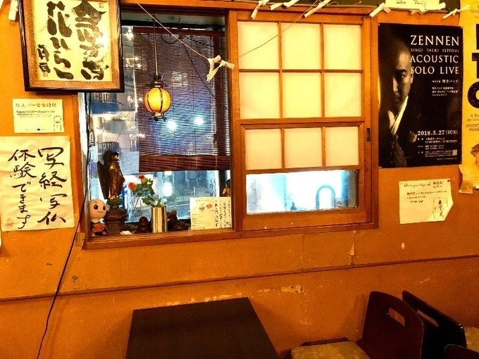 Một điểm nữa khiến quán bar này nổi bật là thực khách có thể cùng cầu kinh Phật với các sư thầy. Sau khi phát cho khách những tờ giấy ghi bản kinh Phật bằng tiếng Nhật có phiên âm, các sư thầy sẽ thắp nến trên ban thờ và mời mọi người cùng tụng kinh. Nghi thức này diễn ra khoảng 10 phút và có hướng dẫn bằng cả tiếng Nhật và tiếng Anh.