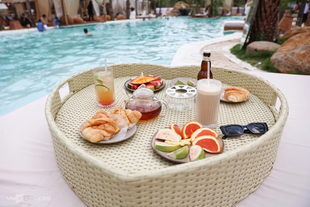Một trong những trải nghiệm được nhiều khách yêu thích tại quán là thưởng thức đồ ăn trên khay nổi giữa hồ bơi. Các món ăn và nước uống được sắp xếp gọn gàng trên khay nổi chuyên dụng, sau đó thả xuống mặt nước. Du khách có thể vừa ngâm mình thư giãn, vừa dùng bữa và chụp ảnh trong không gian mát mẻ, riêng tư.