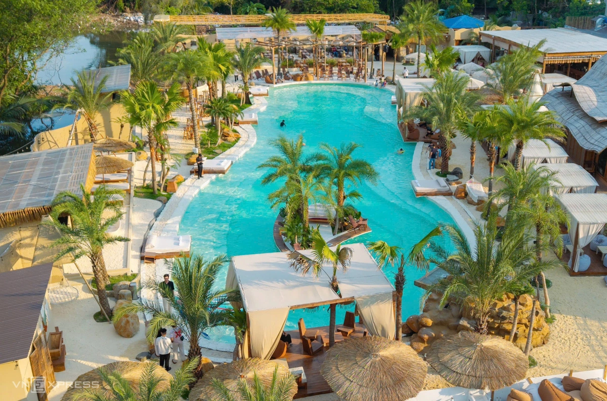 Lều và giường nghỉ được bố trí dọc theo hồ, phục vụ nhu cầu thư giãn của khách sau khi bơi. Các vật liệu sử dụng như gỗ, vải và dây thừng, mang đến cảm giác gần gũi và tự nhiên.