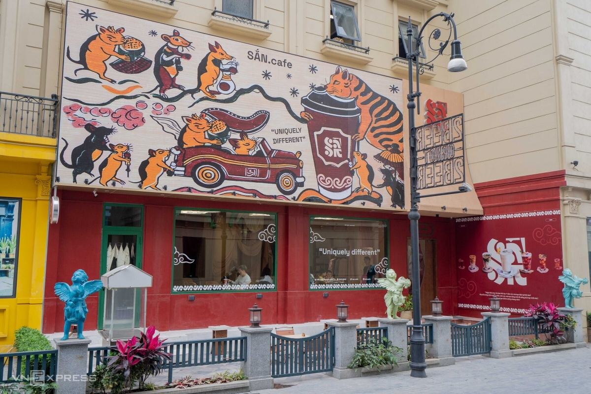 Quán Sắn.cafe tại Nguyễn Xiển mở cửa hơn hai tháng, gây chú ý với cổng chính là bức tranh đám cưới chuột được AI biến tấu.