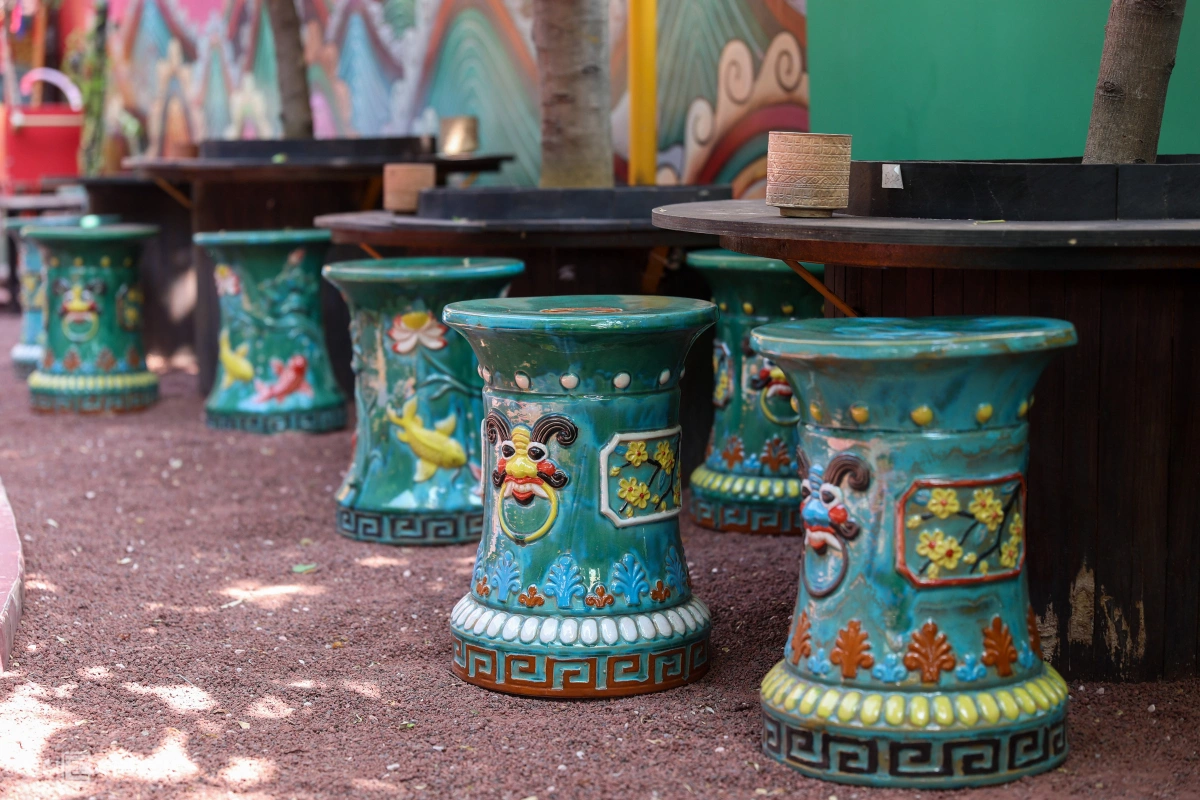 Ở không gian Nhạc phủ, nổi bật là những ghế đôn làm bằng gốm, tráng men xanh, trang trí hình ảnh dân gian, được nhập từ Bình Dương.