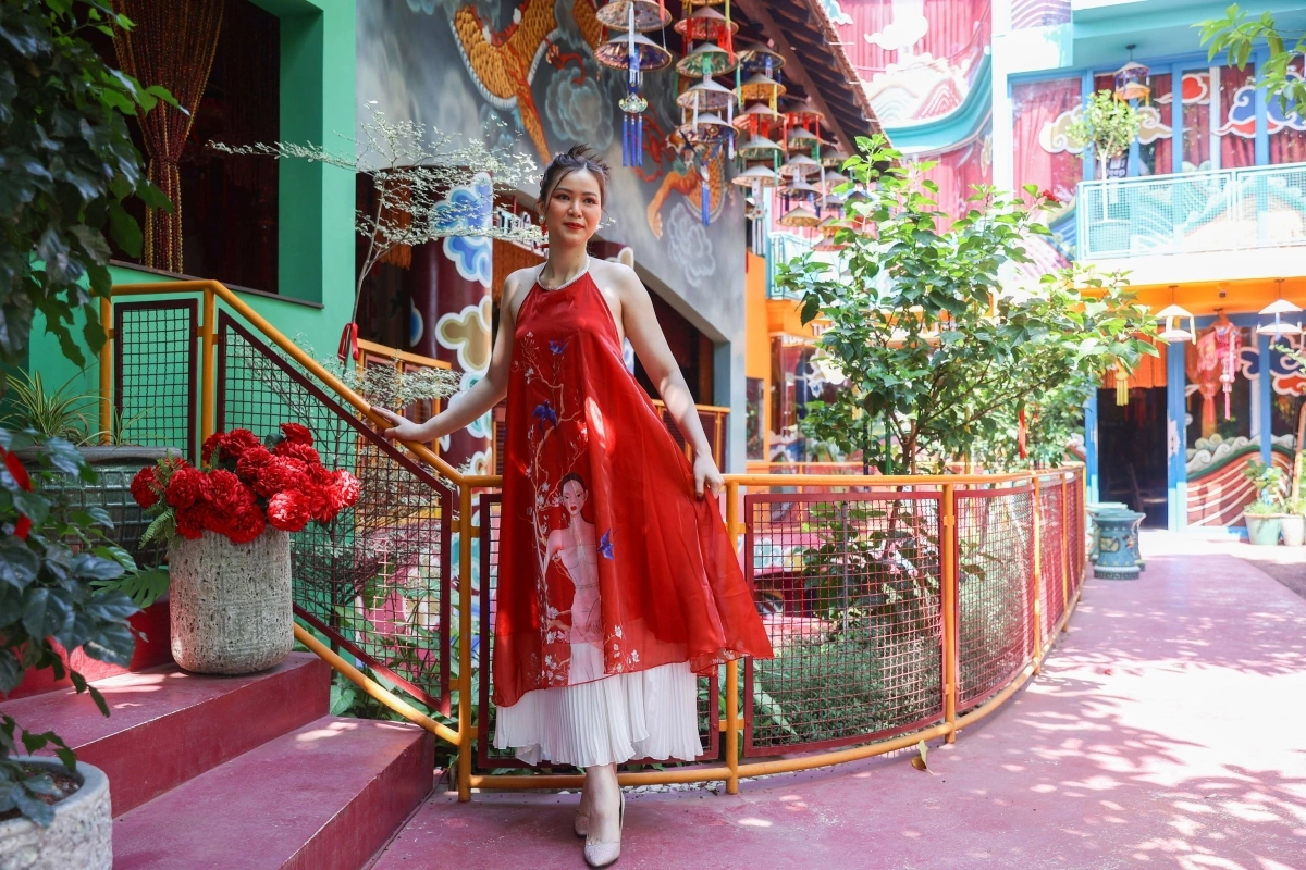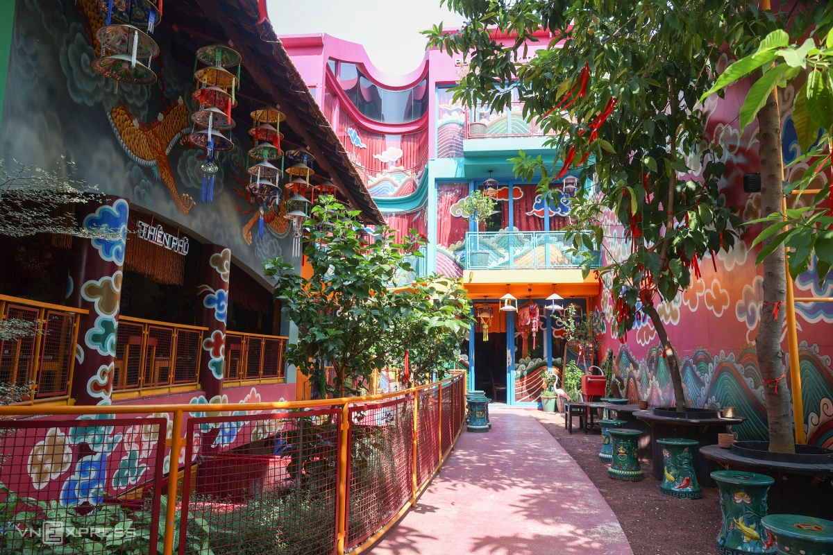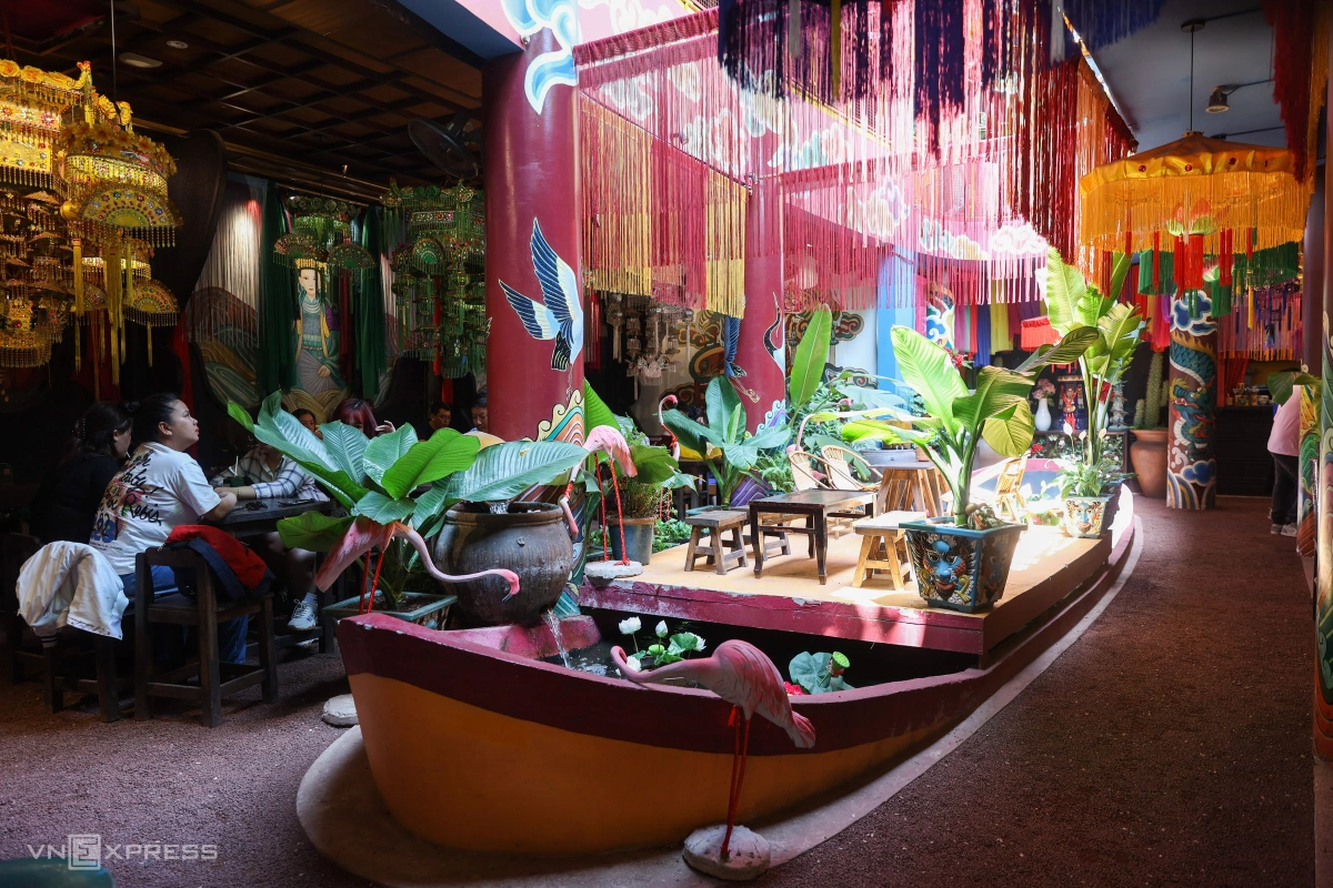 Quán cà phê trên đường Điện Biên Phủ hút khách bởi tông màu rực rỡ, bên ngoài như một ngôi chùa, hoạt động hơn nửa năm nay. "Qua cách trang trí, tranh ảnh, đồ vật thì quán muốn truyền tải nét đặc sắc của văn hoá thờ Mẫu đến nhiều người", anh Lê Xuân Phú, quản lý, cho biết.