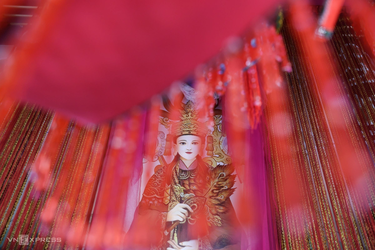 Một bức tranh vẽ Mẫu Thượng Thiên hay còn được gọi là Mẫu Đệ Nhất, là người cai quản Thiên phủ. "Với mỗi tranh trang trí trên tường, quán phải tham khảo tài liệu rồi phác hoạ trên máy tính trước khi vẽ", quản lý cho biết.