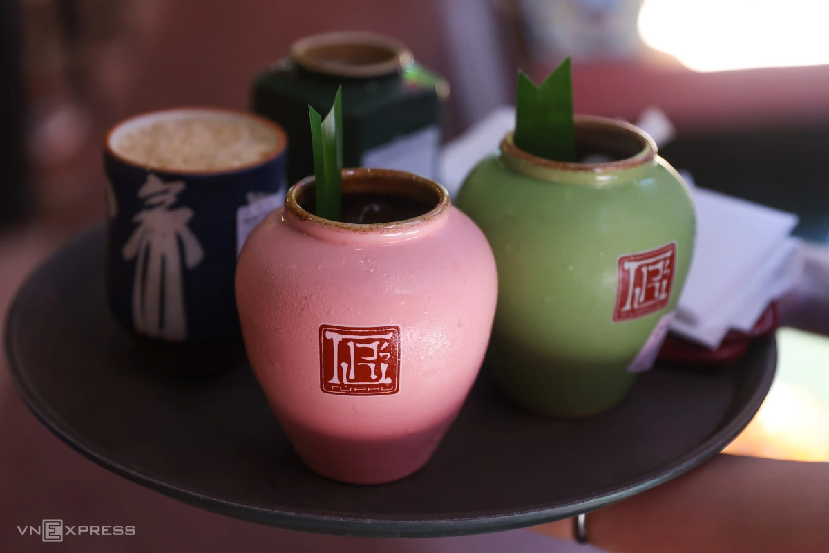 Giá đồ uống dao động từ 45.000 đến 70.000 đồng, một số món được để trong hũ lạ mắt. Đồ uống được đặt tên cách điệu như: cậu nhất đệ hoàng thiên (cà phê đen), cô bảy kim giao (trà đào), chiêu dung công chúa (xí muội đá xay). Ngoài ra còn có bánh ngọt và đồ chay vào buổi trưa.