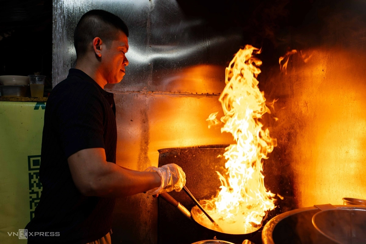 Quán có khoảng 20 bàn, khách ra vào liên tục. Thi thoảng, một số người kỹ tính yêu cầu đích thân chủ quán vào bếp xào tái lăn.