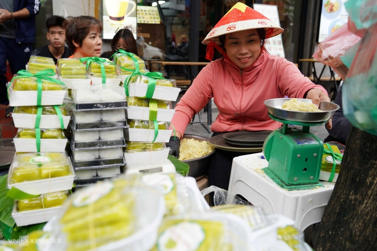 Sản phẩm cốm năm nay không đổi, chủ yếu vẫn là xôi, bánh cốm. Lượng hàng tiêu thụ tăng đột biến nên chị phải nhập thêm từ làng cốm Mễ Trì.
