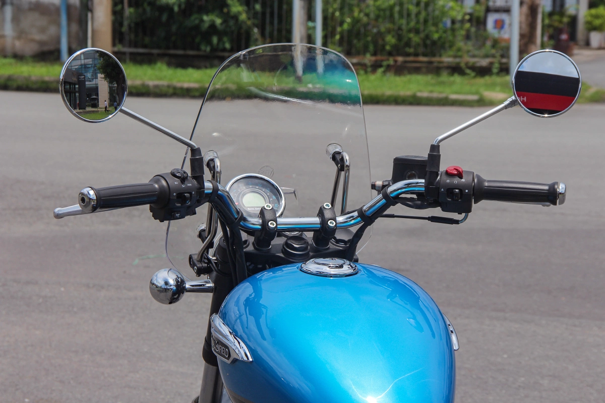 Đặc trưng dòng cruiser, tay lái Meteor 350 đặt cao và góc lái rộng. Đồng hồ tốc độ dạng cơ kết hợp LCD.