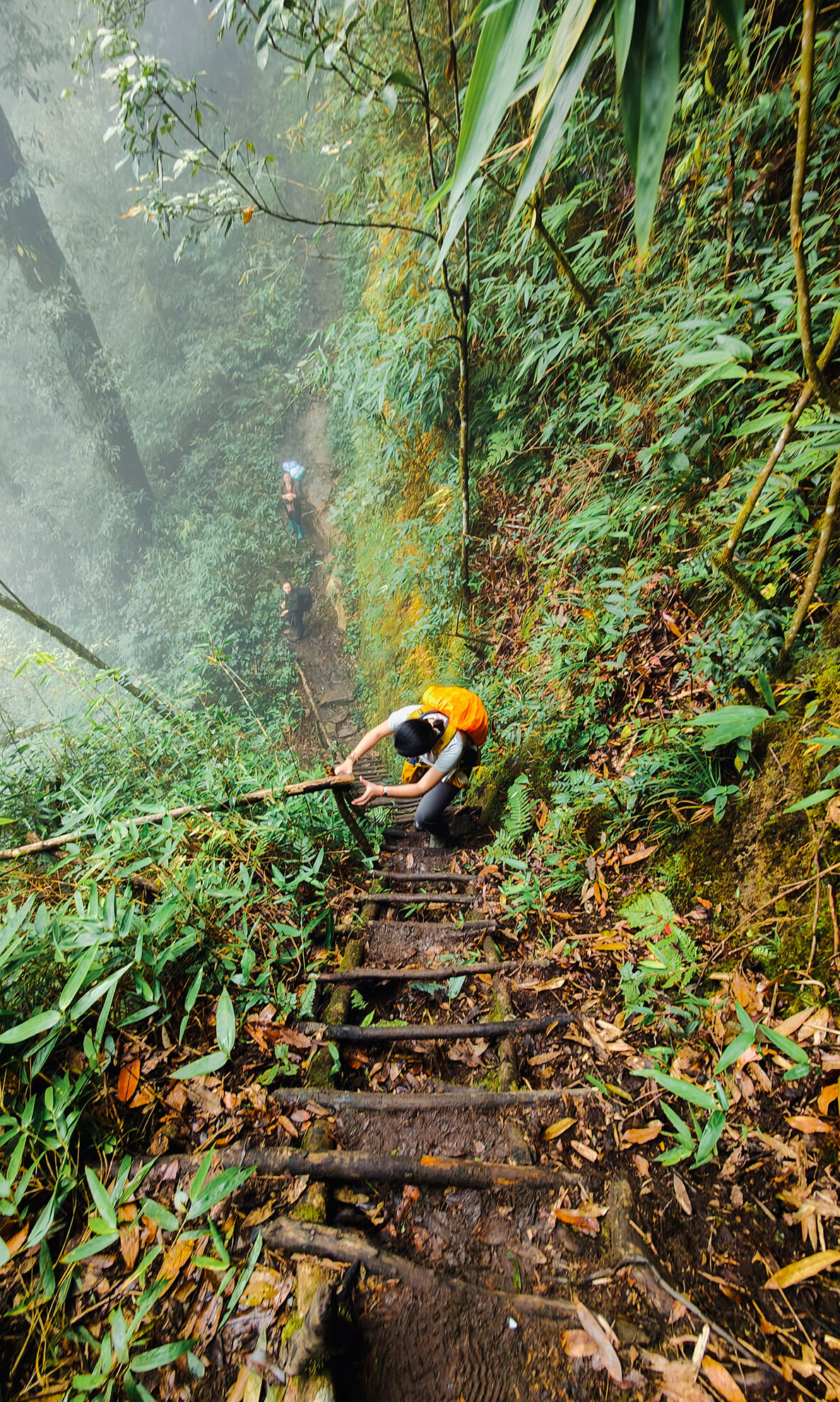 Đường trekking lên đỉnh Ngũ Chỉ Sơn là con đường mòn giữa những dải núi đá trùng điệp nối tiếp nhau chạy dài vô tận, trên đầu là biển mây bồng bềnh, phía dưới là vực sâu.