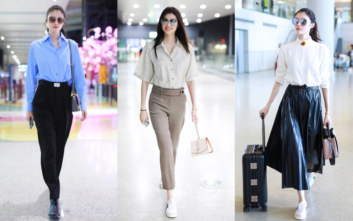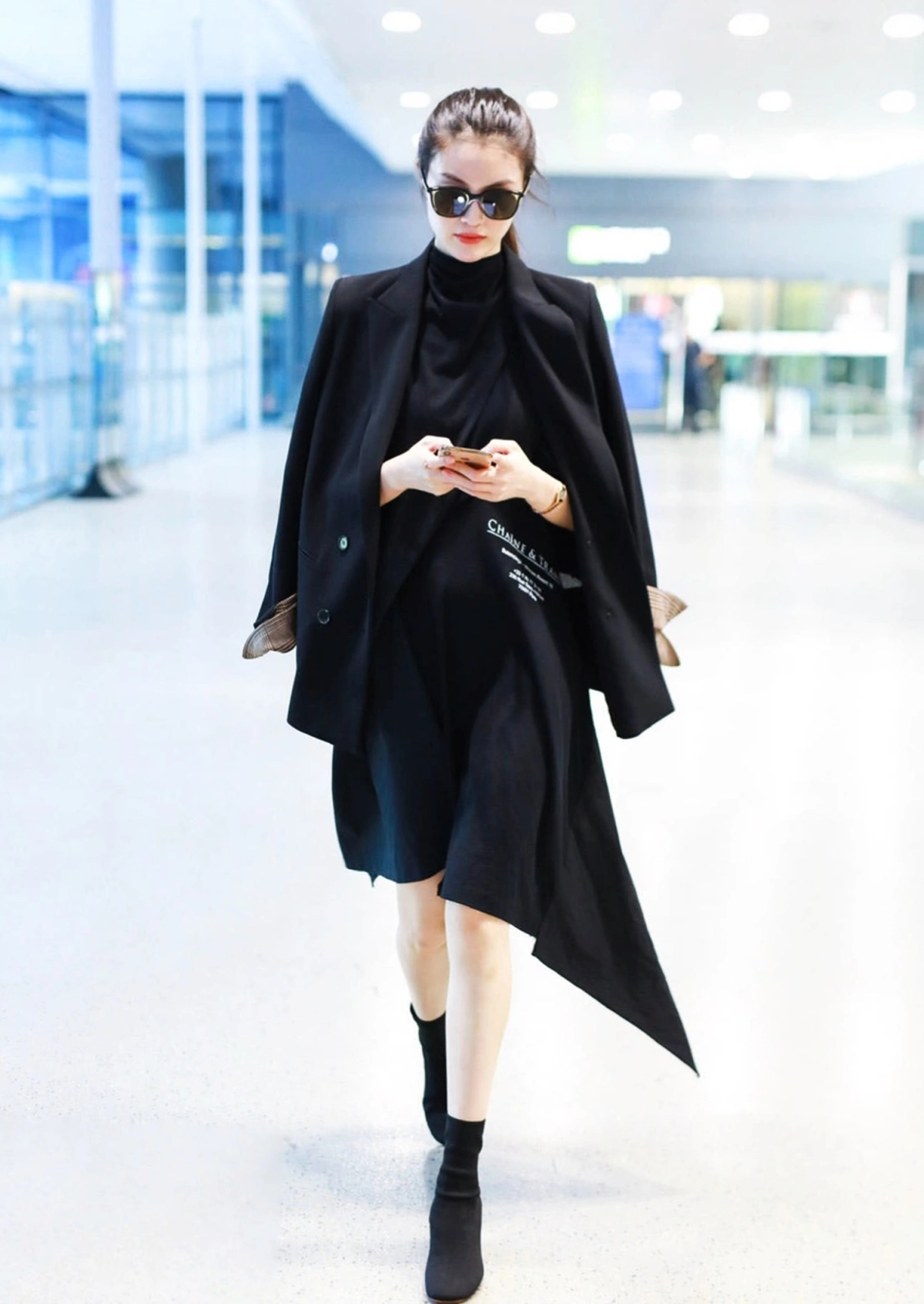 Cô tiếp tục ghi điểm với cây đen trong lần xuất phát từ sân bay Thượng Hải đi Bắc Kinh. Nhờ chiều cao 1,78 m và diện mạo sáng, Hà Tuệ hợp với mọi phong cách thời trang.
