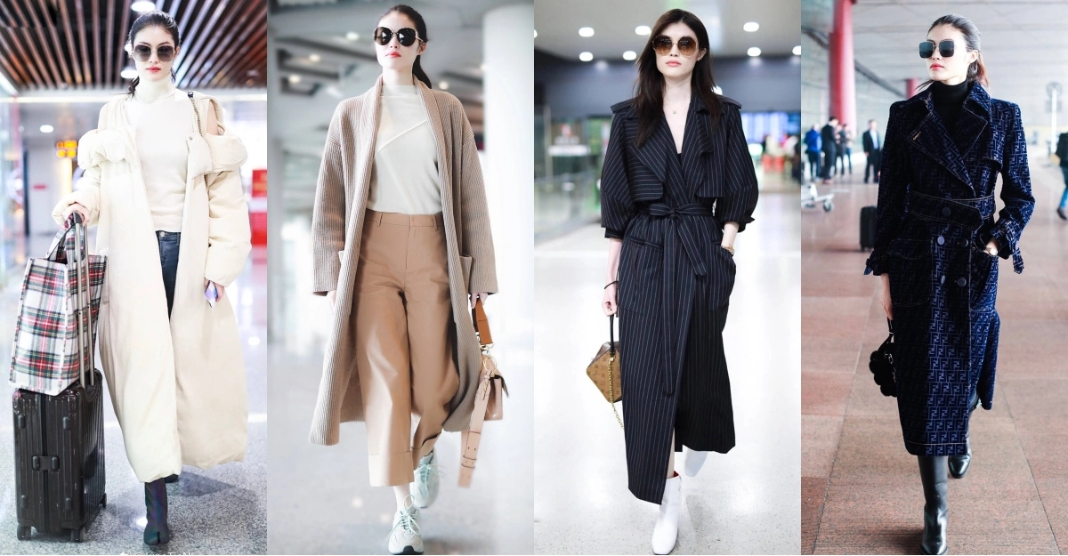 Hà Tuệ diện trench coat màu be, mang túi Louis Vuitton ở sân bay Thượng Hải. Video: JunoTien.