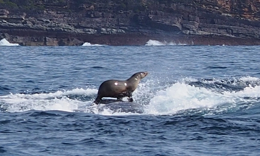Một con hải cẩu cưỡi trên lưng cá voi lưng gù ở vùng biển ngoài khơi New South Whales, Australia. Ảnh: Robyn Malcolm/Diimex.com.