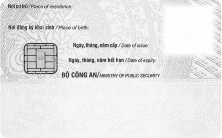 Mặt sau có vân tay ngón trỏ trái và phải; họ, chữ đệm và tên cha, quốc tịch; họ, chữ đệm và tên mẹ, quốc tịch; họ, chữ đệm và tên vợ (chồng), quốc tịch; họ, chữ đệm và tên của người đại diện hợp pháp, người giám hộ, người được giám hộ, quốc tịch; ngày, tháng, năm.