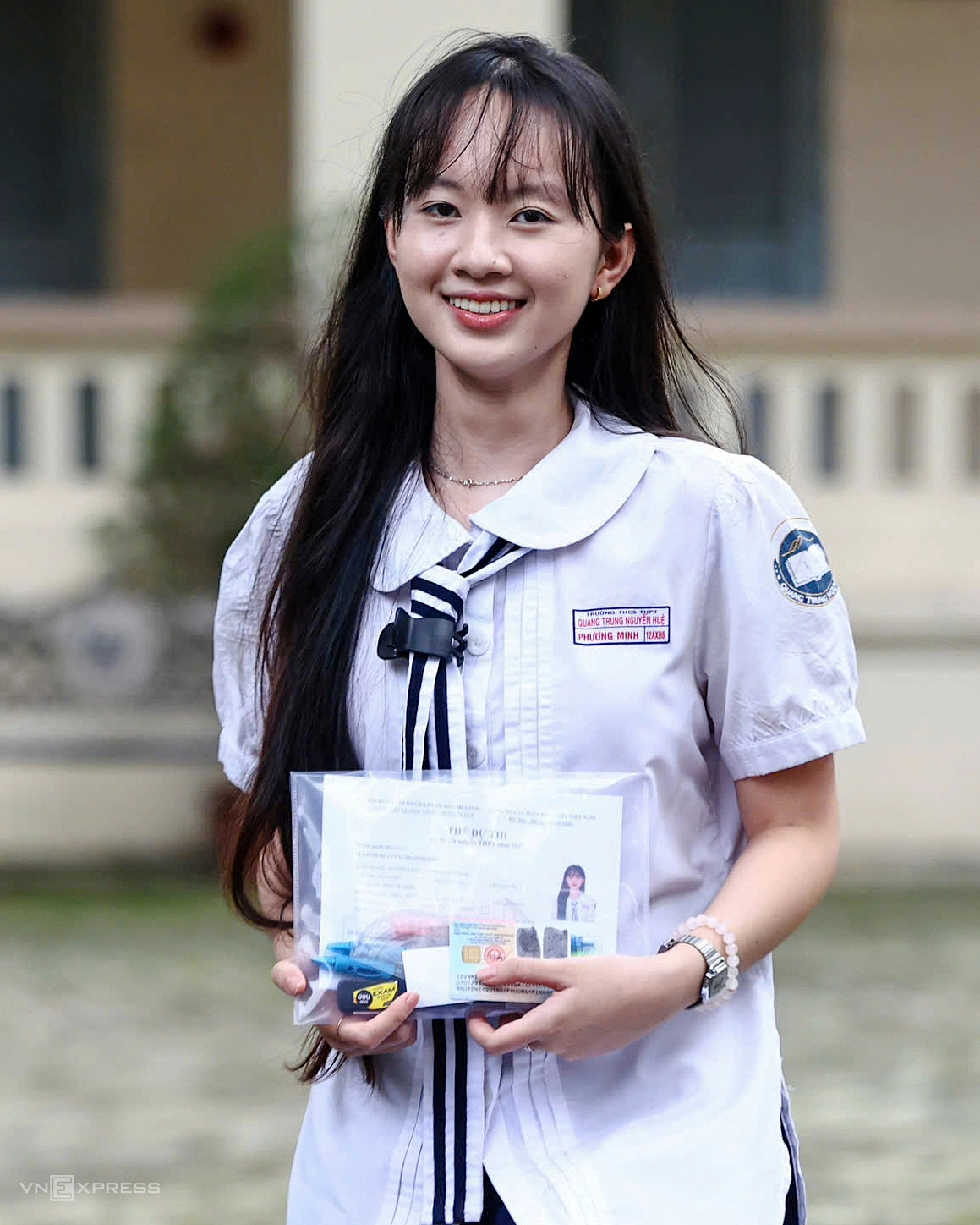 Phương Minh, nữ sinh trường THPT Quang Trung, Nguyễn Huệ, nói lo nhất môn Toán, còn lại đều tự tin, nhất là Tiếng Anh. Nguyện vọng của em là đỗ Đại học Kinh tế TP HCM. Ảnh: Quỳnh Trần