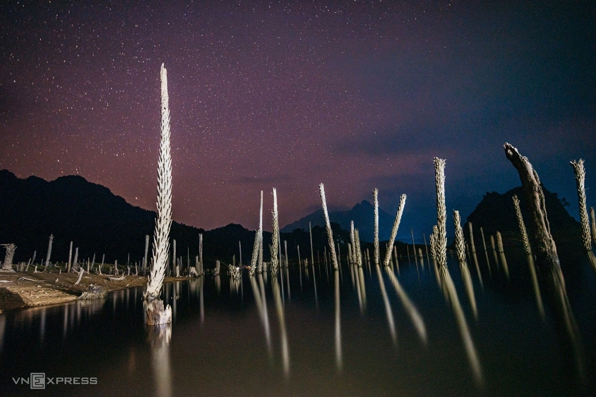 Điểm hạ trại của nhóm anh Hải nằm ngay cạnh những cây cọ chết khô huyền ảo dưới bầu trời đêm đầy sao. Theo chia sẻ của người dân nơi đây, bãi cọ này ngập trong nước, phần trên nhô lên cao nên còn ví như bãi cọc Bạch Đằng. Vào mùa nước cạn, bãi cọ sẽ lộ thiên nhiều hơn và là nơi hấp dẫn du khách tham quan với nhiều góc chụp ảnh đẹp.