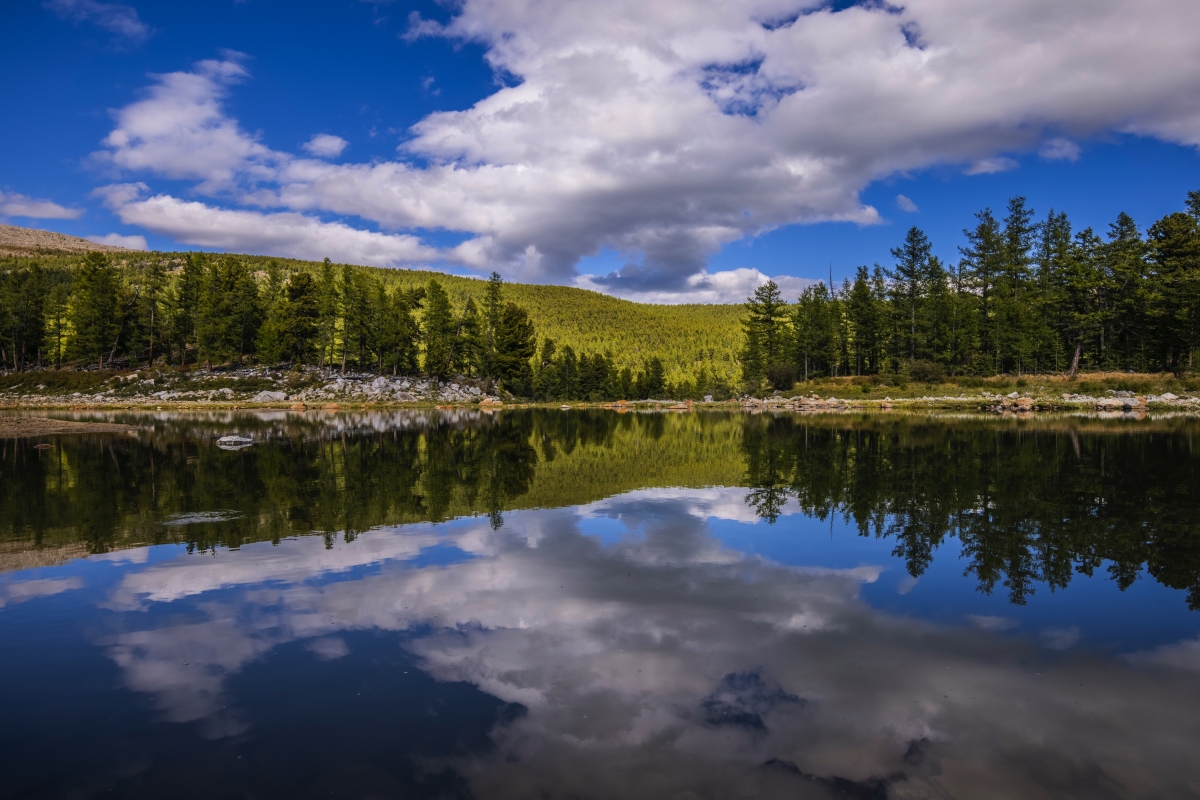 Một hồ nước trên núi soi bóng trong rừng Taiga trên hành trình đến nhà người du mục chăn tuần lộc. Đây là một trong những phần của lịch trình được nhiều du khách ấn tượng, mong chờ trong chuyến đi Mông Cổ.