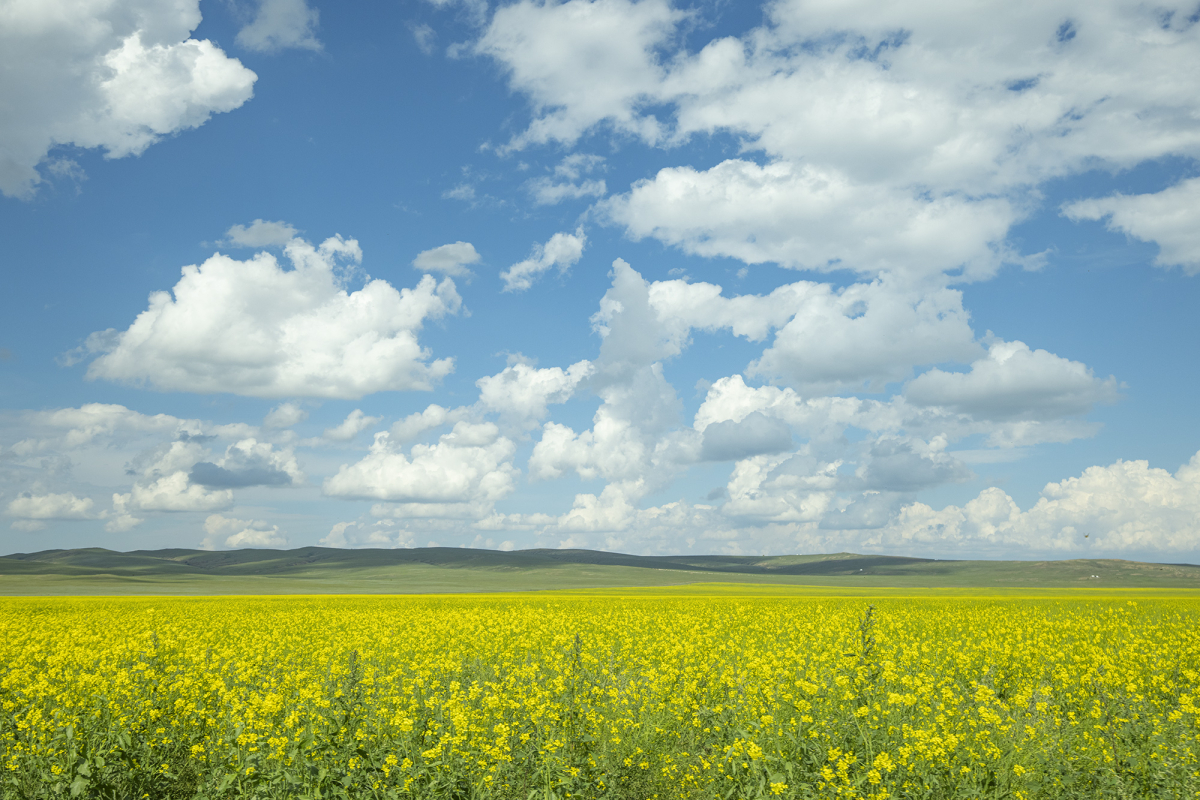 Một cánh đồng hoa cải vàng giữa thảo nguyên trên con đường dẫn đến Khuvsgul, hồ lớn thứ hai và sâu nhất tại Mông Cổ. Đây cũng là một trong 17 hồ cổ đại trên thế giới.