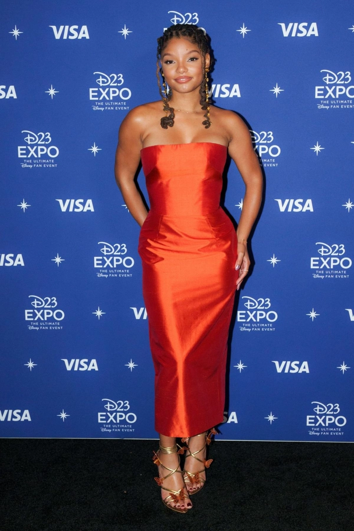 Halle Bailey diện đầm quây ngực tại sự kiện Disney's D23 Expo hôm 9/9, cùng êkíp giới thiệu thước phim đầu tiên của dự án "The Little Mermaid" bản người đóng. Ảnh: HC