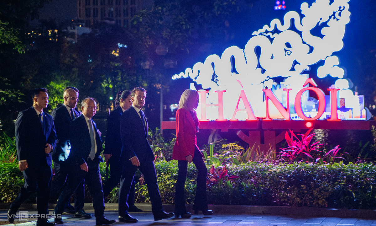 Sau khi di chuyển từ sân bay Nội Bài đến khách sạn, ông Macron và phu nhân đi bộ ra Hồ Gươm cùng một số cận vệ vào khoảng 22h.
