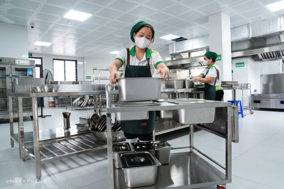 Khu vực bếp nằm ở tầng 1. Khoảng 10h mỗi ngày, nhân viên bếp sẽ chia đồ ăn vào các hộp inox, đưa lên xe đẩy và chuyển đến các tầng bằng thang máy.