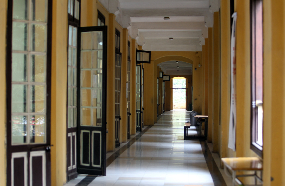 Mặt bằng các tầng bố trí như nhau, bao gồm cầu thang chính ở giữa, mỗi bên bốn lớp học, hồi phải có thang phụ. Hành lang tầng 1 được mở rộng ra sân trường, cuốn vòm, trang trí khá cầu kỳ. Hành lang các tầng 2 và 3 có cửa sổ hai lớp…