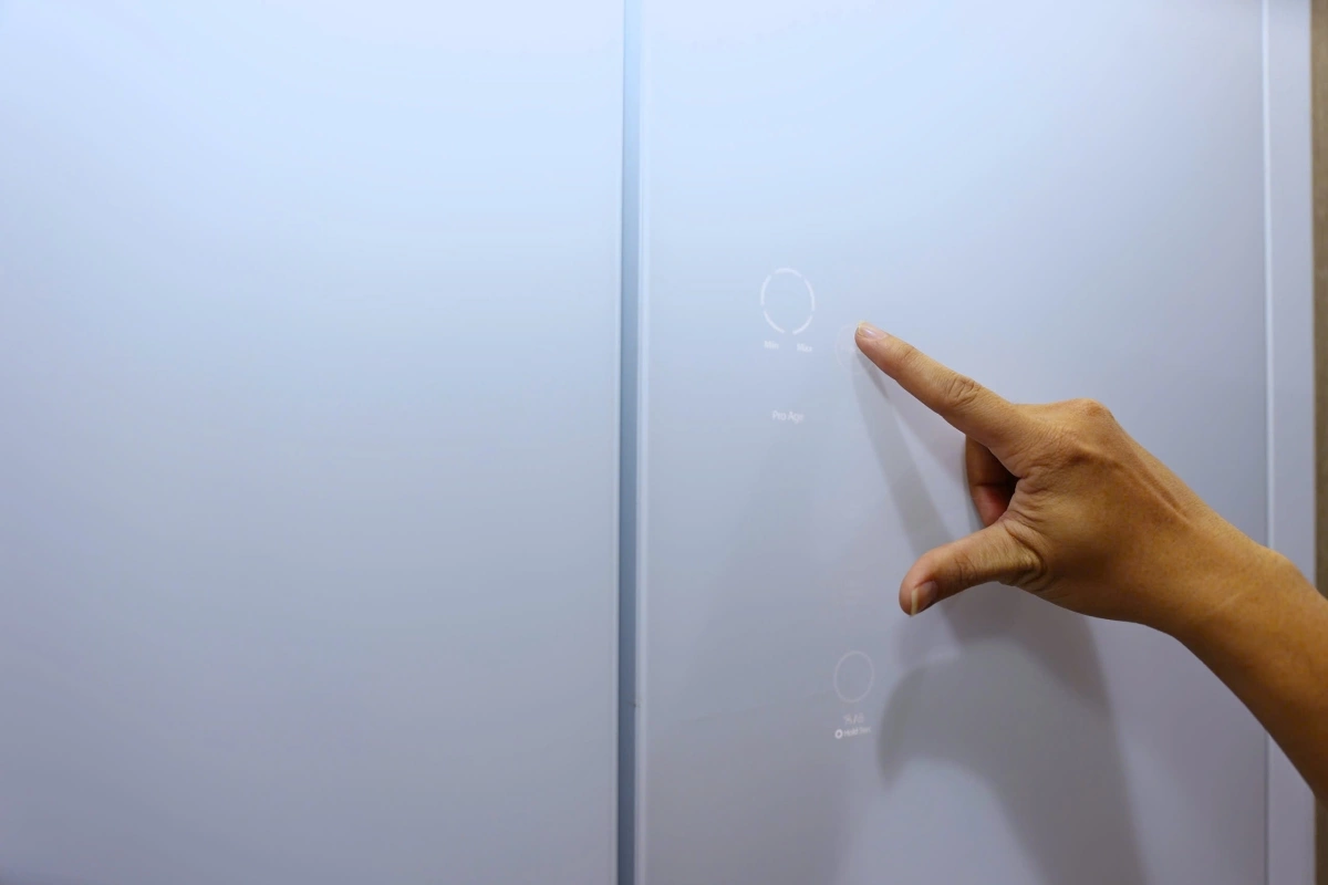Bề mặt tủ trang bị các nút cảm ứng để điều chỉnh chế độ. Mặt kính trắng phủ 10 lớp được nung với công nghệ Nano ở nhiệt độ cao 800 độ C tạo bề mặt trong, dễ vệ sinh. Bề mặt này cũng chống bám vân tay và duy trì độ bền màu theo thời gian.