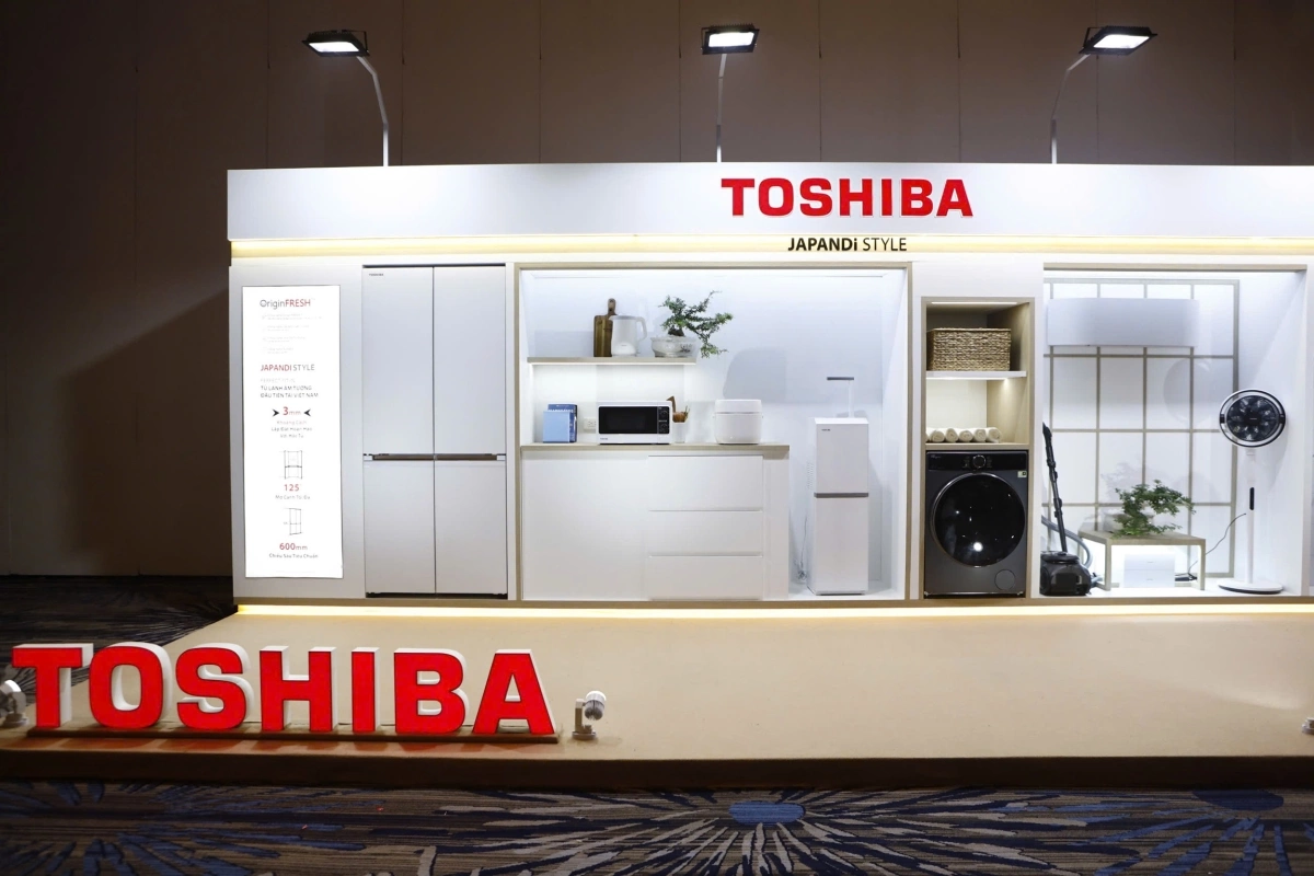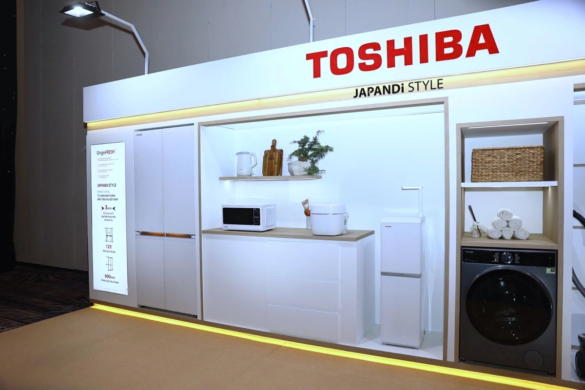 Toshiba Japandi trưng bày trong gian hàng mô phỏng không gian bếp tại Tech Awards hôm 10/1. Thiết kế theo triết lý Japandi, sản phẩm kết hợp giữa sự tối giản của phong cách Nhật và sang trọng của Bắc Âu. Sản phẩm được vinh danh "Tủ lạnh có thiết kế ấn tượng" vào chiều cùng ngày.