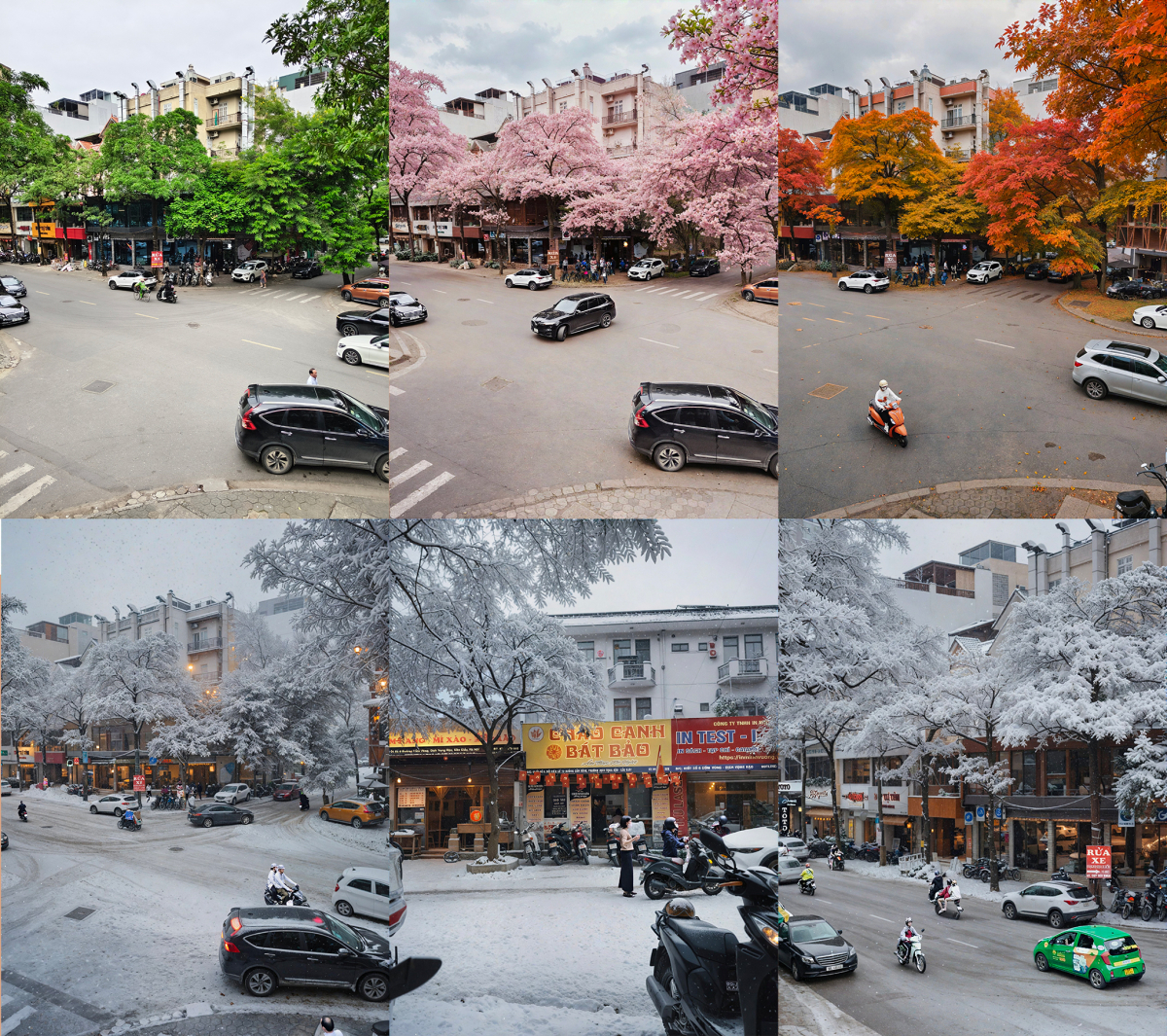 Thử nghiệm ảnh chụp bởi chế độ Chân dung Bốn mùa AI trên V60 Lite. Ảnh ngoài cùng phía trên bên trái chụp bằng camera thường, không xử lý AI trong khi các hình còn lại chọn các mùa tương ứng như xuân, thu. Trong các tình huống xử lý, cây cối thường được chuyển thành lá vàng, đỏ nếu chọn mùa thu hoặc thành sắc hồng như hoa anh đào với mùa xuân. Không chỉ cảnh vật, nhiều chủ thể cũng bị xử lý, đôi lúc mất chi tiết hoặc sai chữ tiếng Việt. Tuy nhiên, đây vẫn là tính năng thú vị mang nét riêng độc đáo của Vivo được nhiều người dùng yêu thích.