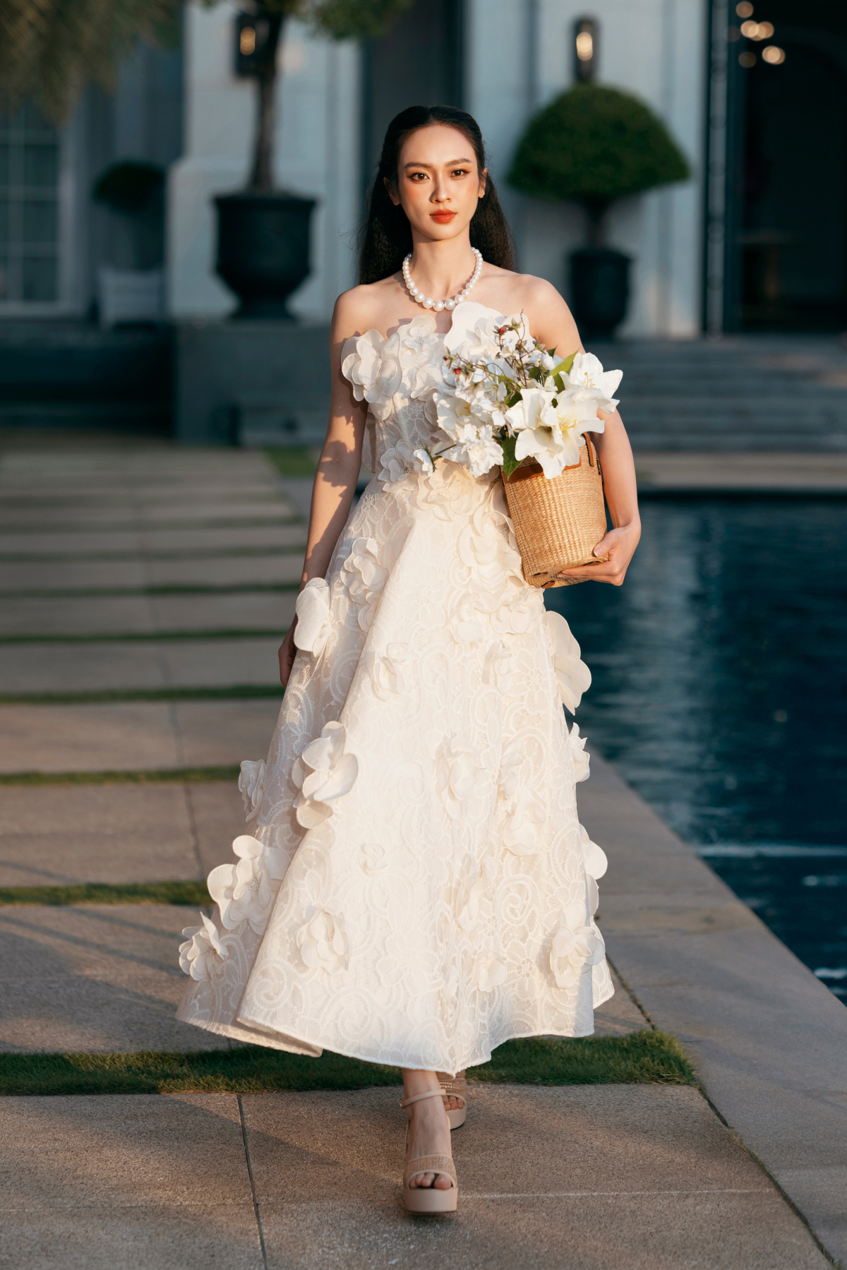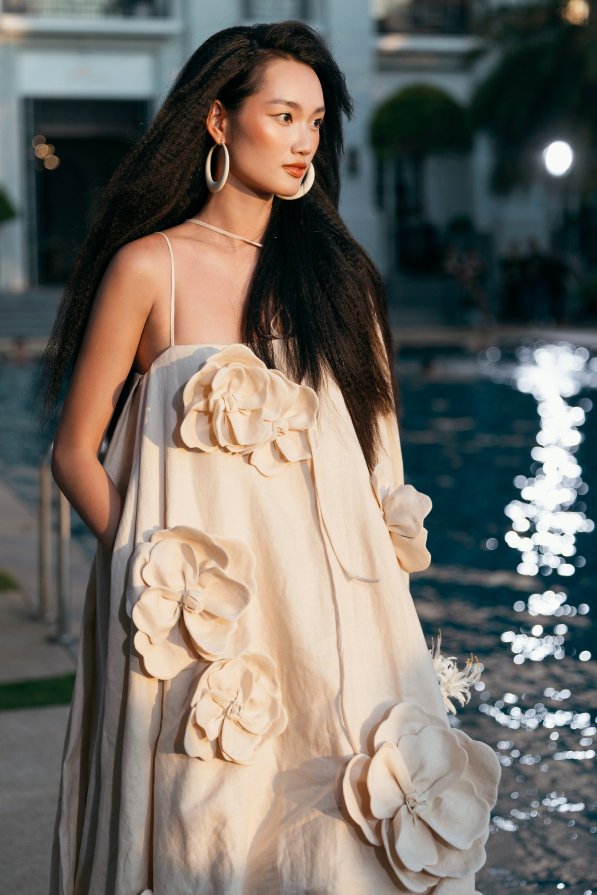 Show diễn ra trong khoảnh khắc hoàng hôn hôm 27/4, bên hồ bơi ở một khu nghỉ hạng sang cạnh sông Sài Gòn. Hoa hậu Khánh Vân mở màn trong bộ đầm cổ yếm kèm áo choàng. Cô kết hợp vòng tay bản lớn mang âm hưởng phóng khoáng và hoài cổ của thập niên 1970, 1980.