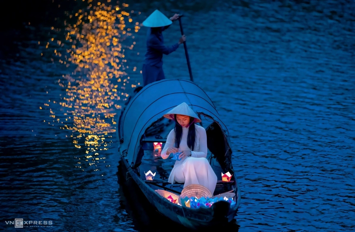 Thiếu nữ diện áo dài trắng trong hoạt cảnh thả Hoa đăng trên dòng Như Ý vào dịp Festival Huế. Những ước muốn của người già, người trẻ đều được gửi vào những cánh hoa đăng trôi nhẹ trên dòng sông, cầu mong no ấm, an lạc và luôn được hạnh phúc.