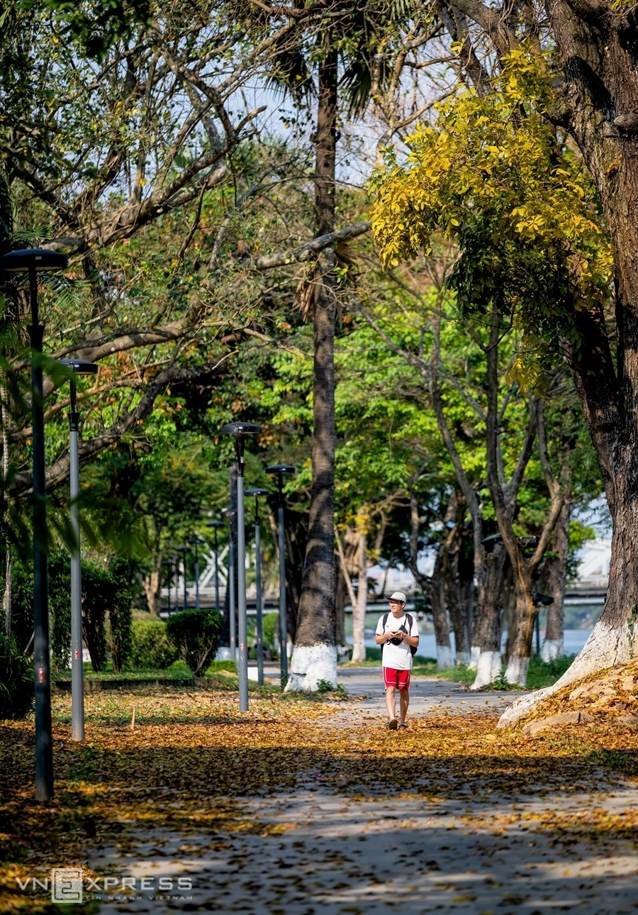 Du khách dạo bước trên tuyến đường bộ dọc bờ bắc sông Hương trong mùa cây thay lá. Người Huế xem sông Hương là dòng sông di sản, bởi vậy cảnh quan hai bên bờ sông luôn được chú trọng.