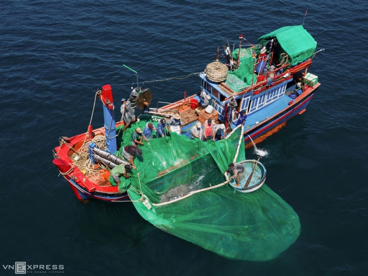 Hoạt động đánh bắt của ngư dân trên tàu với mẻ lưới vây thu hoạch cá cơm. Tàu đánh bắt thường có công suất nhỏ dưới 90 CV (mã lực) nên chủ yếu đánh bắt gần bờ, trên mỗi chuyến tàu gồm 10 - 13 ngư dân.
