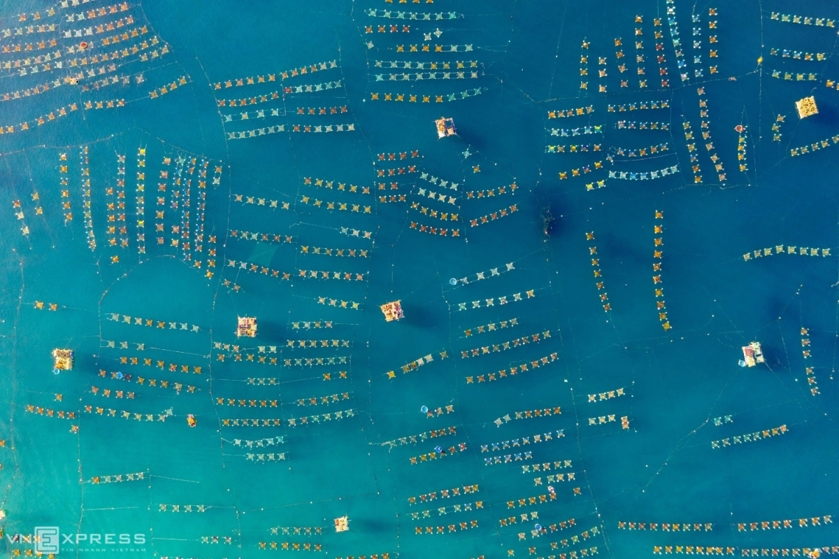 “Hoa lưới” màu xanh trên biển. Nhìn từ trên cao, từng tấm lưới được kéo căng giữa biển, như có sự sắp đặt tài tình của người nghệ sĩ.
