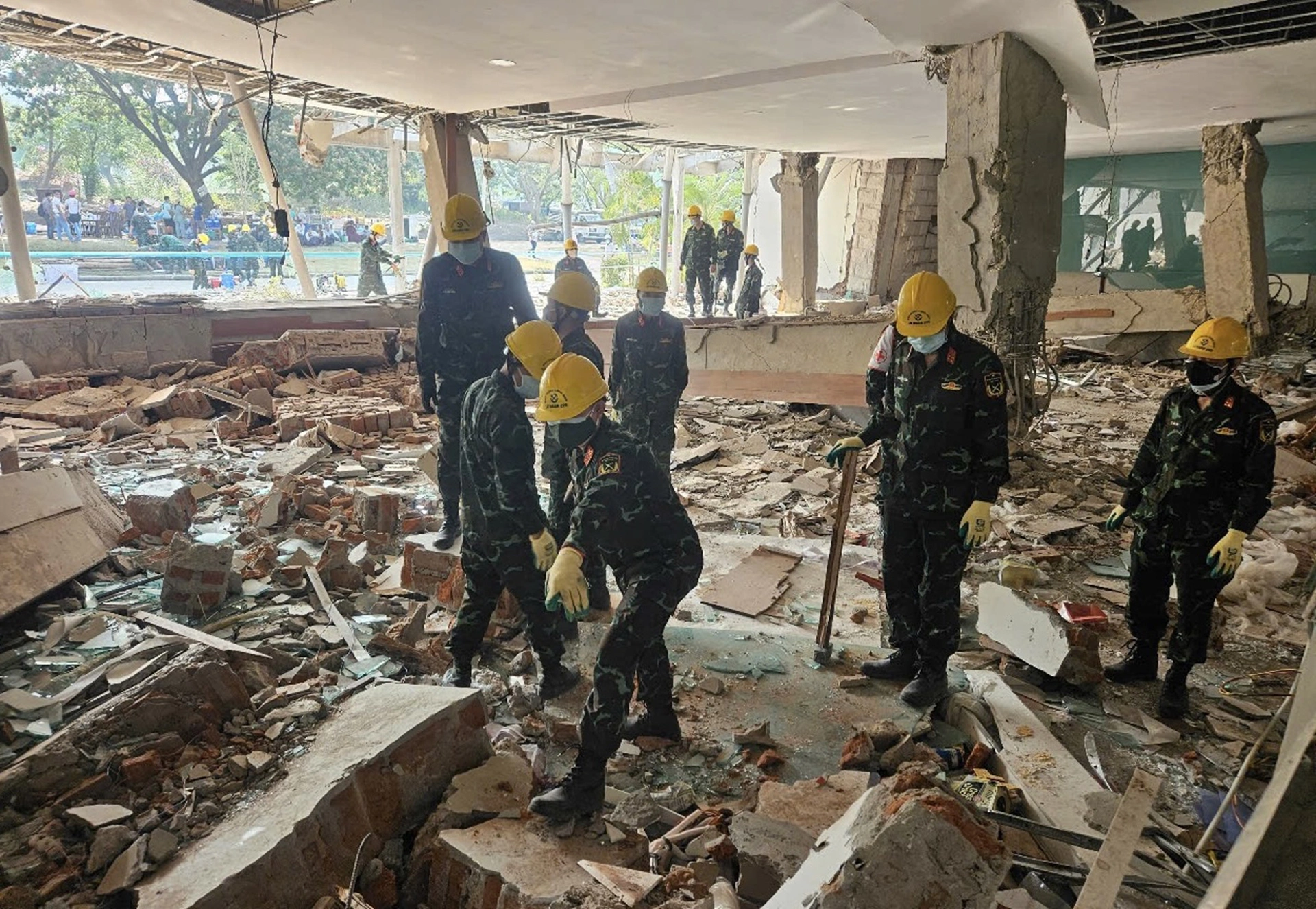 Tám ngày cứu hộ ở Myanmar diễn ra trong nắng nóng trên 40 độ C cùng mùi tử khí bốc lên từ những tòa nhà đổ sập trong trận động đất 7,7 độ. Trên đầu, đối diện các quân nhân đều là những vách tường đang đổ dở. Trong khi họ phải cắt, khoan từng mảng bêtông sau khi chó nghiệp vụ đã xác định được vị trí nguồn hơi. Không gian đậm đặc tử khí, bộ đội đeo ba lớp khẩu trang, xức dầu gió trước mũi, hai bên thái dương để át mùi và chống cảm.
