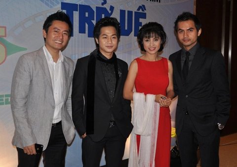 Việt Trinh cùng các diễn viên của phim. Từ trái sang phải: Minh Cường, Quách Tuấn Du, Việt Trinh, Đức Tiến. Ảnh: T.V. |