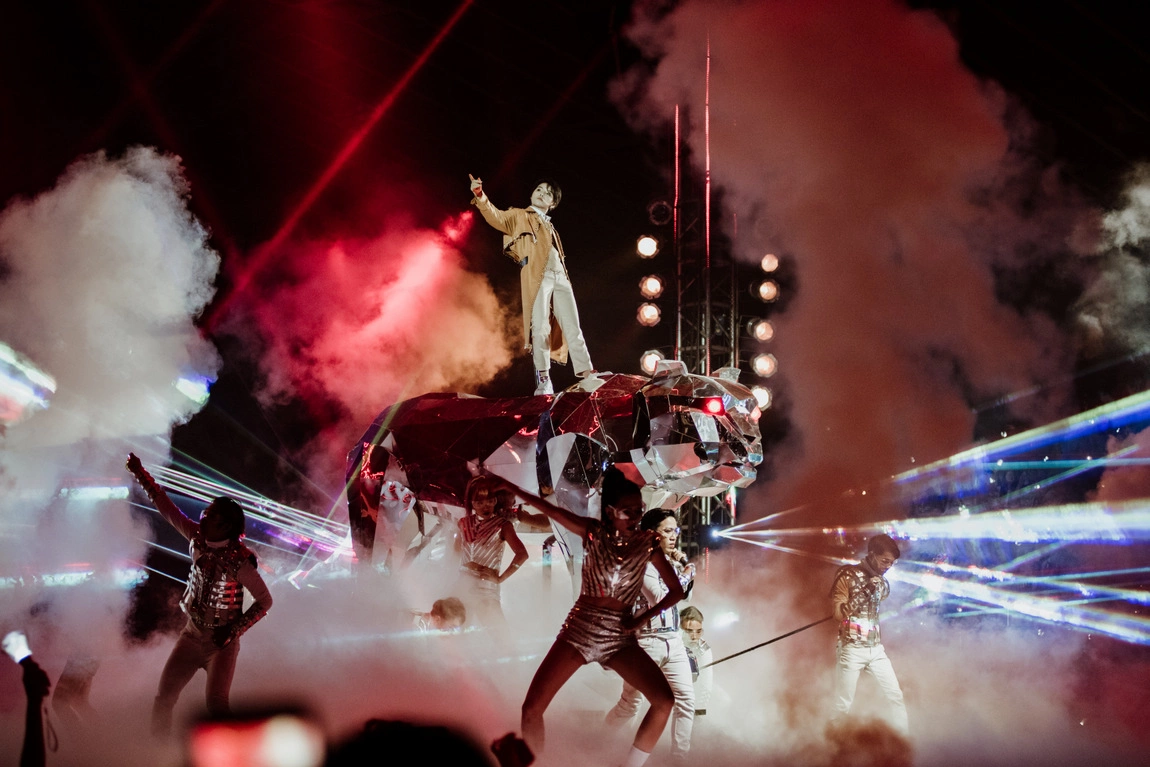 Mở màn, ca sĩ xuất hiện trên lưng mô hình chú báo, trình diễn Leader - một sáng tác từng gây tranh cãi của ca sĩ vào thời điểm ra mắt. Nó cũng cho cô can đảm để làm những điều mới mẻ hơn sau này. Tại đêm nhạc, cô bị ngã từ trên sân khấu xuống khán đài, nhưng nhanh chóng lấy lại tinh thần và diễn tiếp.