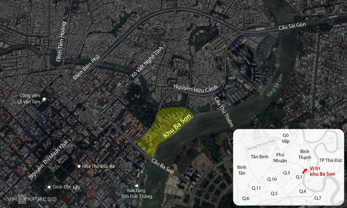 Ba Son nằm ở trung tâm TP HCM, chạy dọc sông Sài Gòn, giáp đường Tôn Đức Thắng và Nguyễn Hữu Cảnh. Khu vực này có một đoạn ngầm của tuyến Metro số 1 chạy qua. Đồ họa: Đăng Hiếu