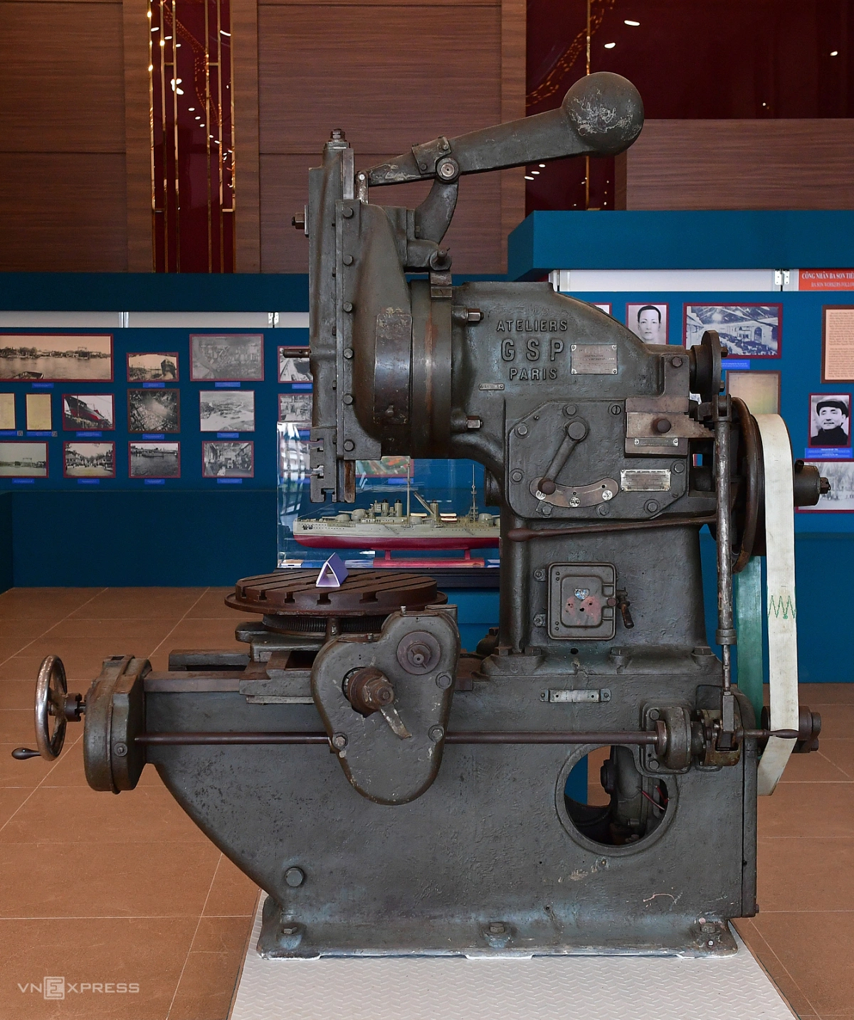 Ở lần triển lãm này, đơn vị tổ chức còn trưng bày những hiện vật liên quan xưởng Ba Son. Trong hình là máy xọc (kiểm tra vật liệu sắt, thép, đá) được Chủ tịch Tôn Đức Thắng dùng trong thời gian làm thợ tại xưởng những năm 1909-1912.
